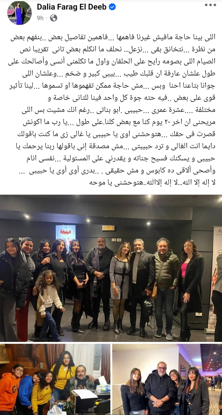 ونشرت داليا فرج صور تجمعها بالراحل سامح عبد العزيز وبناتها، من خلال حسابها الرسمي عبر موقع التواصل الاجتماعي فيسبوك، وودعته من خلال بعدد من الكلمات الحزينة والمؤثرة.