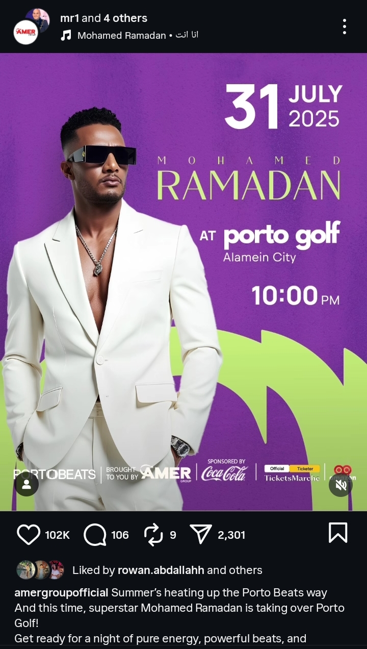 أضافت:" استعد لـ ليلة من الطاقة النقية والإيقاعات القوية واللخظات التي لا تُنسى، في 31 يوليو يرتفع الصوت ويزداد صوت الجمهور ويضئ رمضان المسرح".