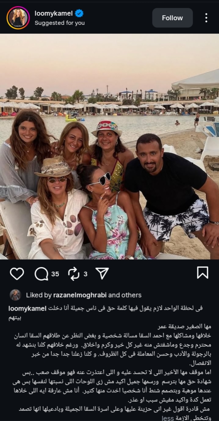 وكتبت لمياء كمال من خلال حسابها الرسمي عبر موقع تبادل الصور والفديوهات القصيرة إنستجرام، قالت:"في لحظة لازم الواحد يقول فيها كلمة حق في ناس جميلة أنا دخلت بيتهم.. مها الصغير صديقة عمر، خلافها ومشاكلها مع أحمد السقا مسألة شخصية، وبغض النظر عن طلاقهم، السقا كان انسان محترم وجدع ومشوفتش منه غير كل خير وكرم وأخلاق".