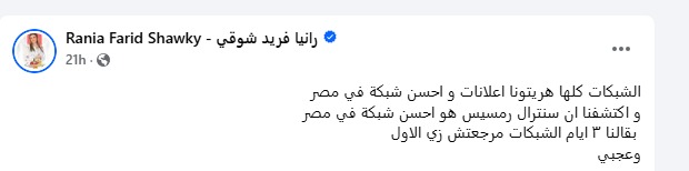 وكتبت رانيا فريد شوقي من خلال حسابها الرسمي عبر موقع التواصل الاجتماعي فيسبوك، قالت: "الشبكات كلها هريتونا اعلانات واحسن شبكة في مصر.. واكتشفنا ان سنترال رمسيس هو احسن شبكة في مصر".