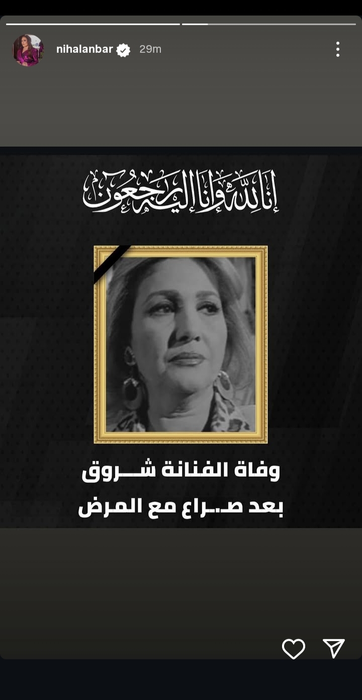 وحرصت الفنانة نهال عنبر على نعي الفنانة شروق، ونشرت صورة لها من خلال حسابها الرسمي عبر موقع تبادل الصور والفديوهات القصيرة إنستجرام، عبر خاصية استوري، وكتبت: "أنا لله وإنا إليه راجعون.. وفاة الفنانة شروق بعد صراع مع المرض".