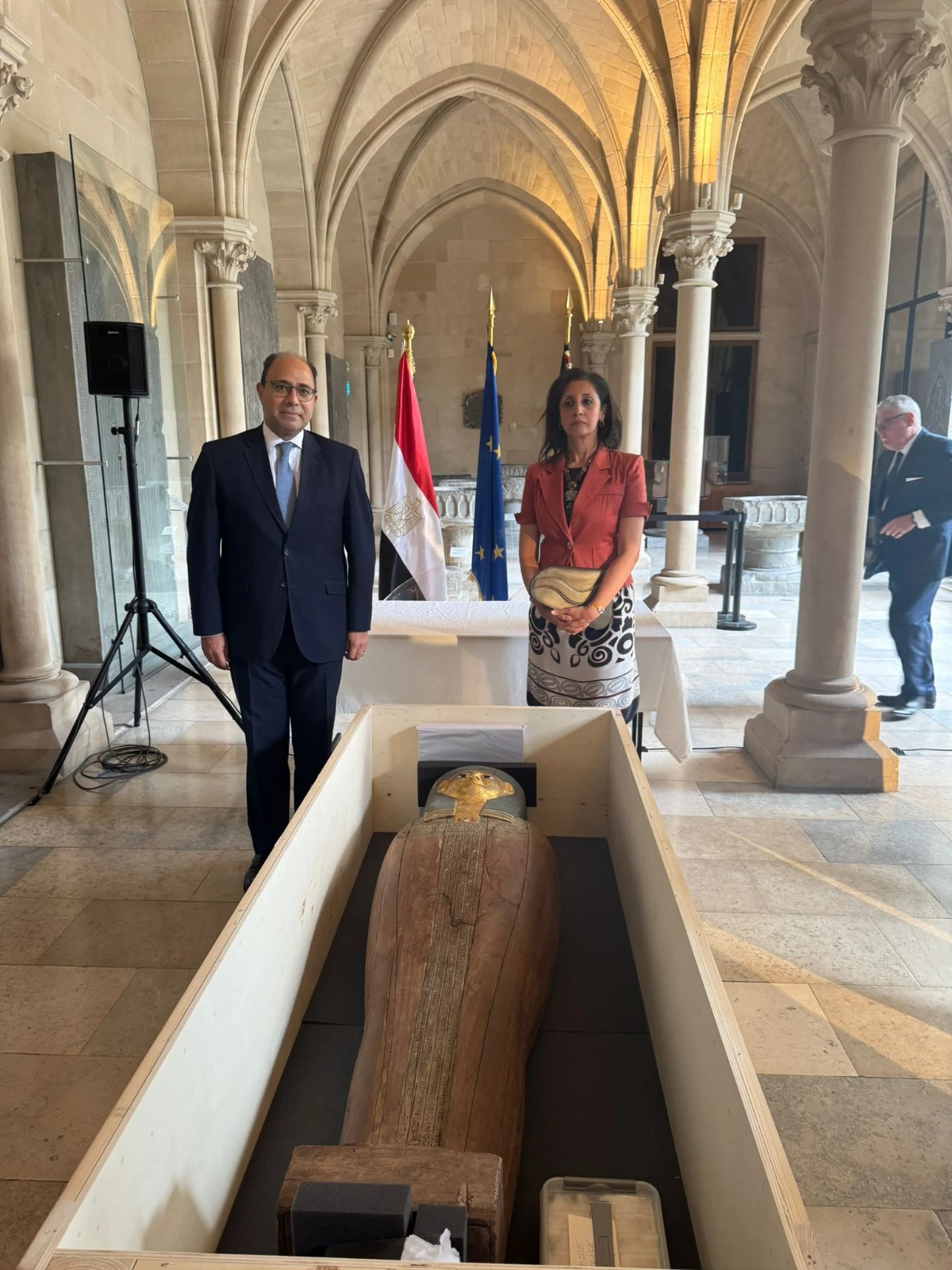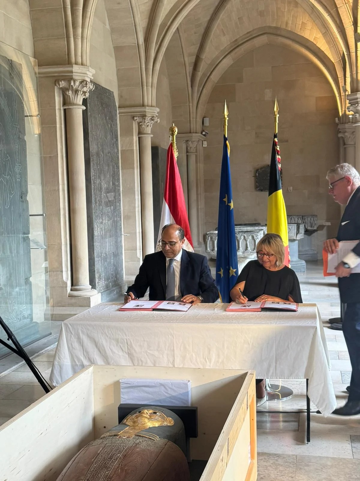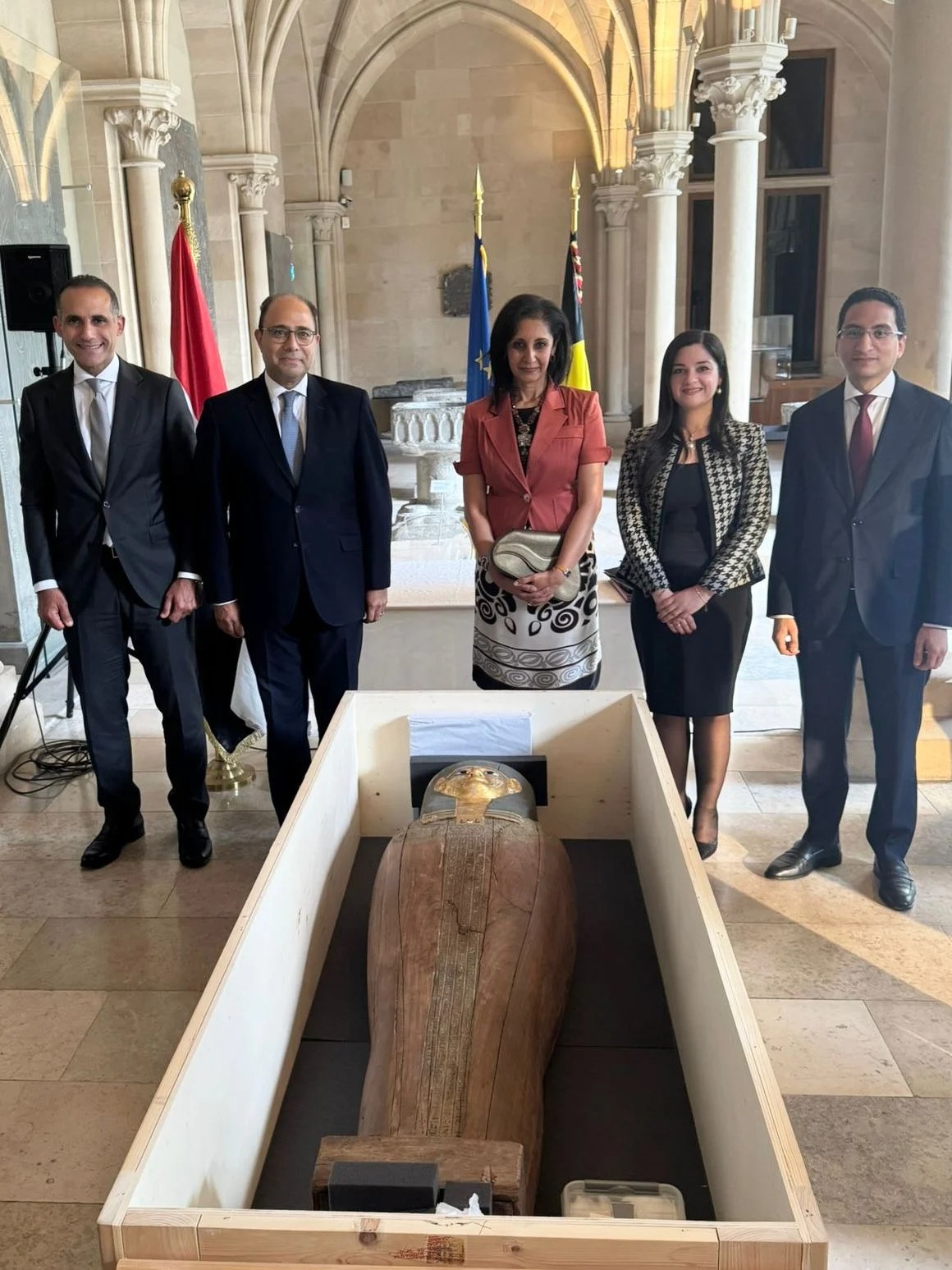 يأتي ذلك في إطار التعاون والتنسيق القائم والمستمر بين السفارة المصرية في بروكسل ووزارتي الخارجية والاقتصاد البلجيكيتين، بالإضافة إلى مكتب النائب العام البلجيكي، والذي أثمر مؤخراً عن استرداد قطعتين أثريتين مصريتين، أحدهما لتابوت خشبي قَيم يعود للعصر البطلمي (ما بين القرنين الثالث والأول قبل الميلاد) منقوش عليه كتابات ورسومات مذهبة، والثاني لحية لتمثال من الخشب تعود للحضارة المصرية القديمة.