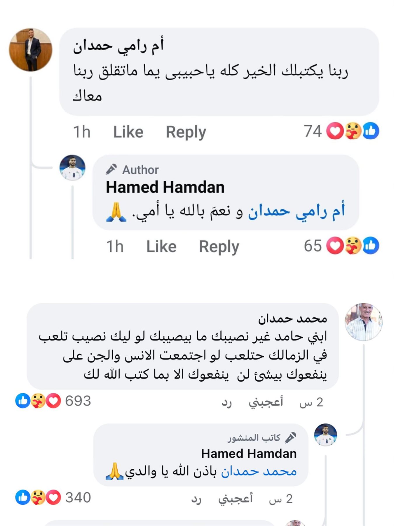 ورد والده على المنشور برسالة إيمانية مؤثرة قائلاً: "ابني حامد، غير نصيبك ما بيصيبك، لو ليك نصيب تلعب في الزمالك هتلعب، لو اجتمعت الإنس والجن على ينفعوك بشيء، لن ينفعوك إلا بما كتب الله لك"، في إشارة إلى ارتباط اسم ابنه بنادي الزمالك.