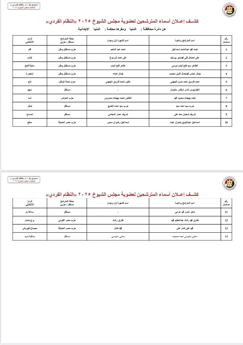 نشرت الهيئة الوطنية للانتخابات الكشوف المبدئية للمرشحين لعضوية مجلس الشيوخ 2025 ورموزهم، عن دائرة محافظة المنيا والبالغ عددهم 14 مترشحًا والمعلقة بمحكمة المنيا الابتدائية.