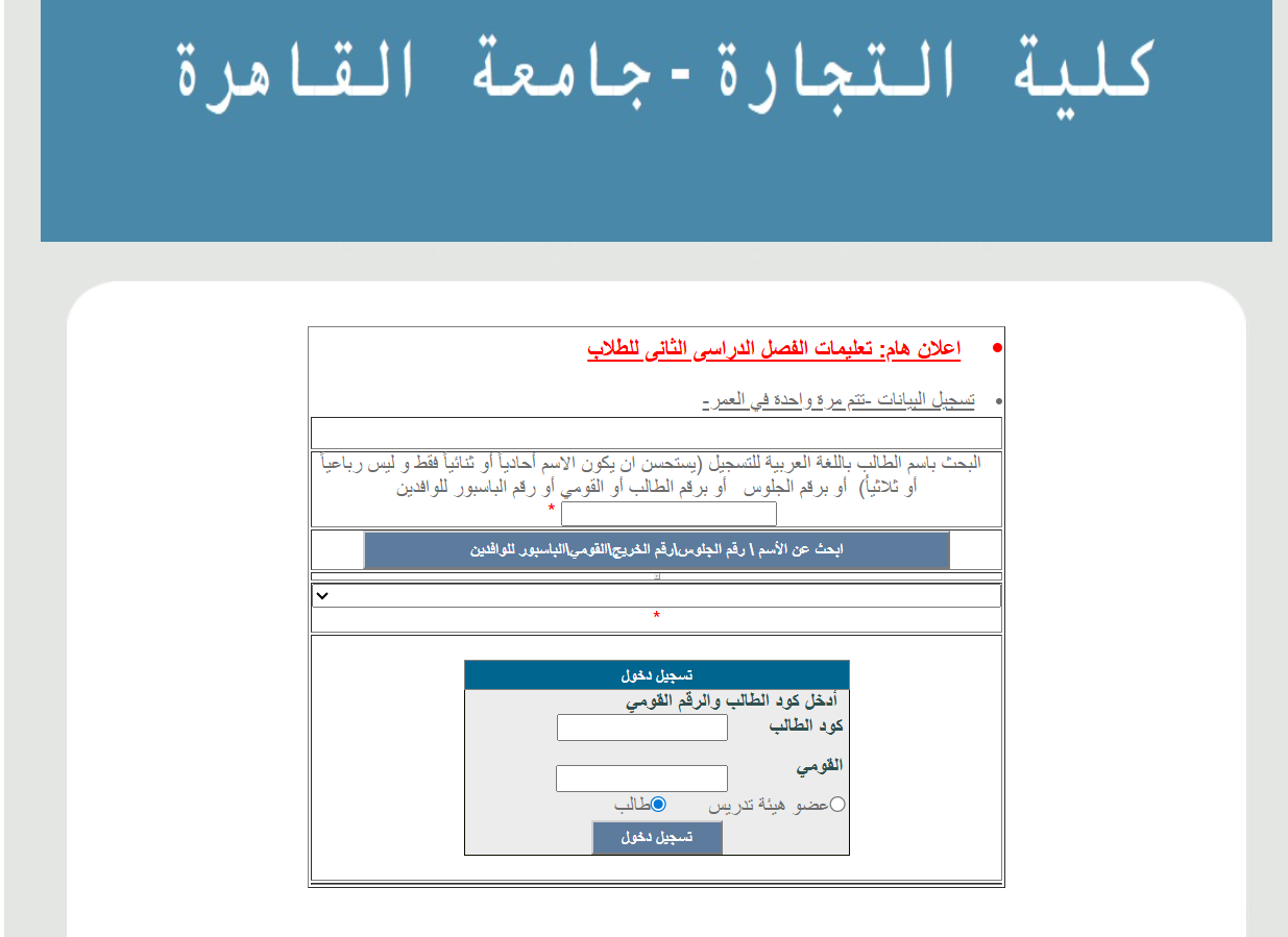 1. التوجه أولًا إلى الموقع الرسمي لكلية التجارة – جامعة القاهرة.