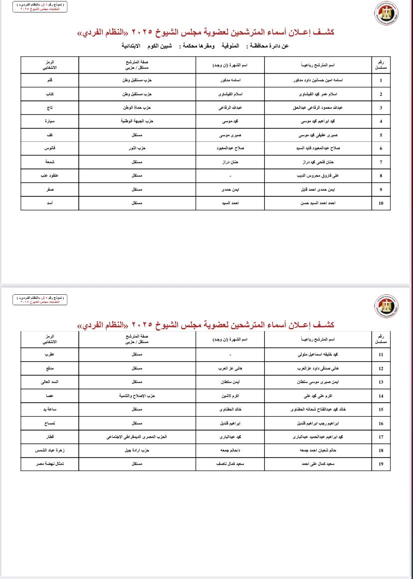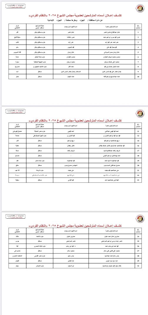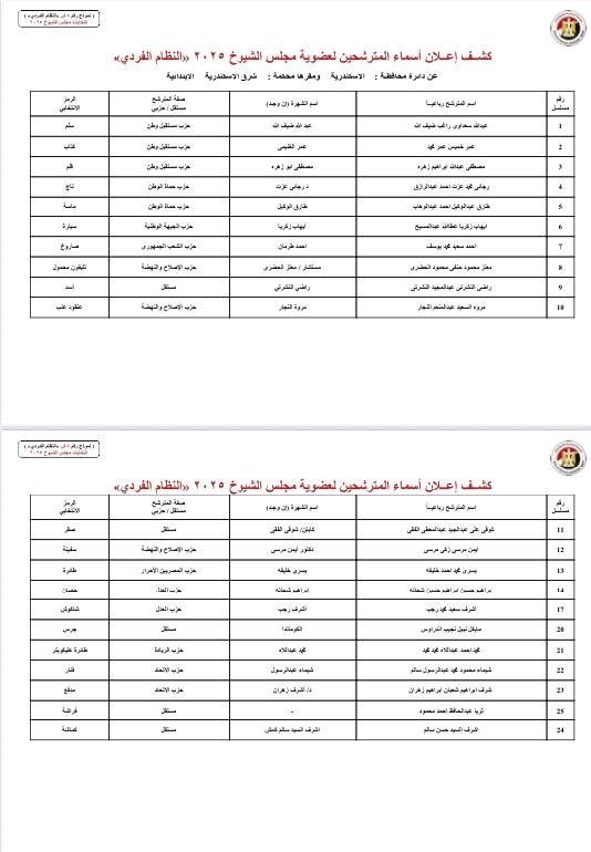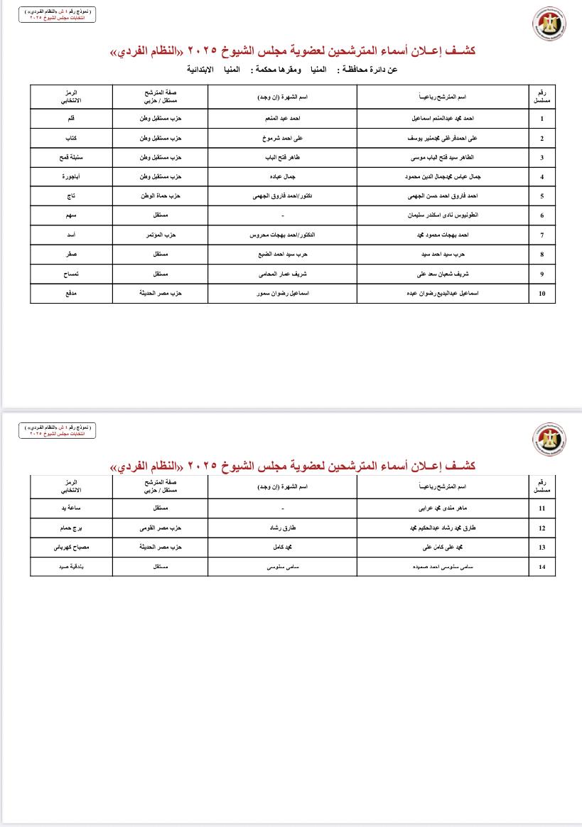 وأعلنت الهيئة الوطنية للانتخابات عن نشر الكشوف المبدئية لأسماء 469 مرشحا بالنظام الفردى ورموزهم الانتخابية، وأسماء 100 مرشح أساسي ومثلهم احتياطيا على نظام القائمة، وذلك فى انتخابات عضوية مجلس الشيوخ 2025.