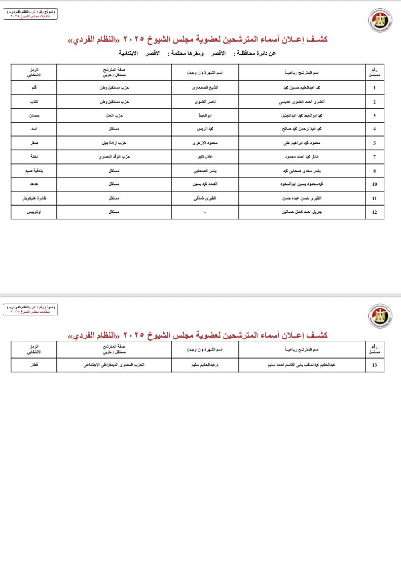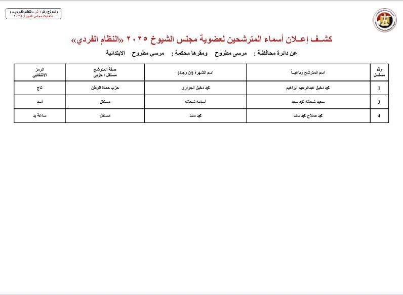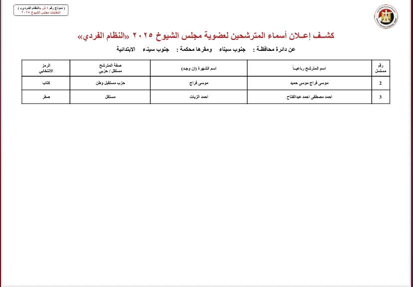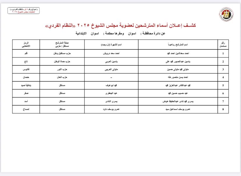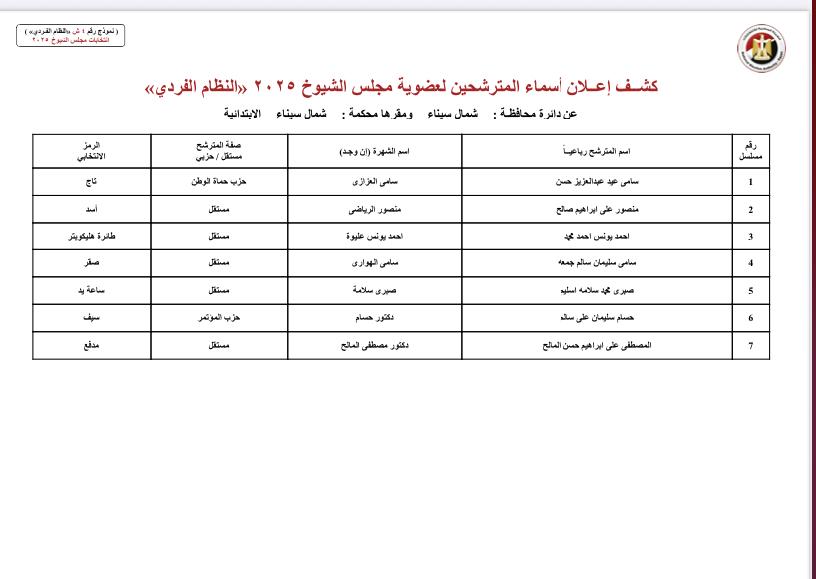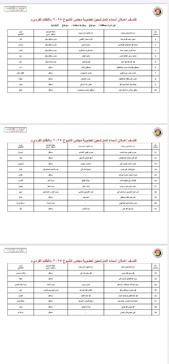 وأعلنت الهيئة الوطنية للانتخابات عن نشر الكشوف المبدئية لأسماء 469 مرشحا بالنظام الفردى ورموزهم الانتخابية، وأسماء 100 مرشح أساسي ومثلهم احتياطيا على نظام القائمة، وذلك فى انتخابات عضوية مجلس الشيوخ 2025.