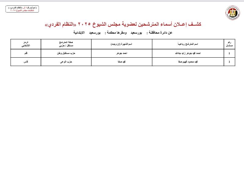 أسماء مرشحي النظام الفردى ورموزها الانتخابية فى جميع المحافظات كالتالى: