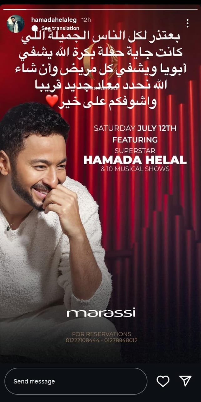 وكتب حمادة هلال من خلال حسابه الرسمي عبر موقع تبادل الصور والفيديوهات القصيرة "إنستجرام"، عبر خاصية استوري، قال: "بعتذر لكل الناس الجميلة اللي كانت جاية حفلة بكرة.. الله يشفي أبويا ويشفي كل مريض، وإن شاء الله نحدد معاد جديد قريبًا، وأشوفكم على خير".