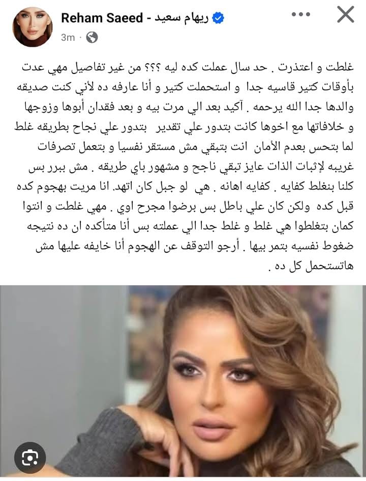 وكتبت ريهام سعيد من خلال حسابها الرسمي عبر موقع التواصل الاجتماعي "فيسبوك"، قالت: "غلطت و اعتذرت، حد سال عملت كده ليه ؟؟؟ من غير تفاصيل مهي عدت بأوقات كتير قاسيه جدا و استحملت كتير و أنا عارفه ده لأني كنت صديقه والدها جدا الله يرحمه ".