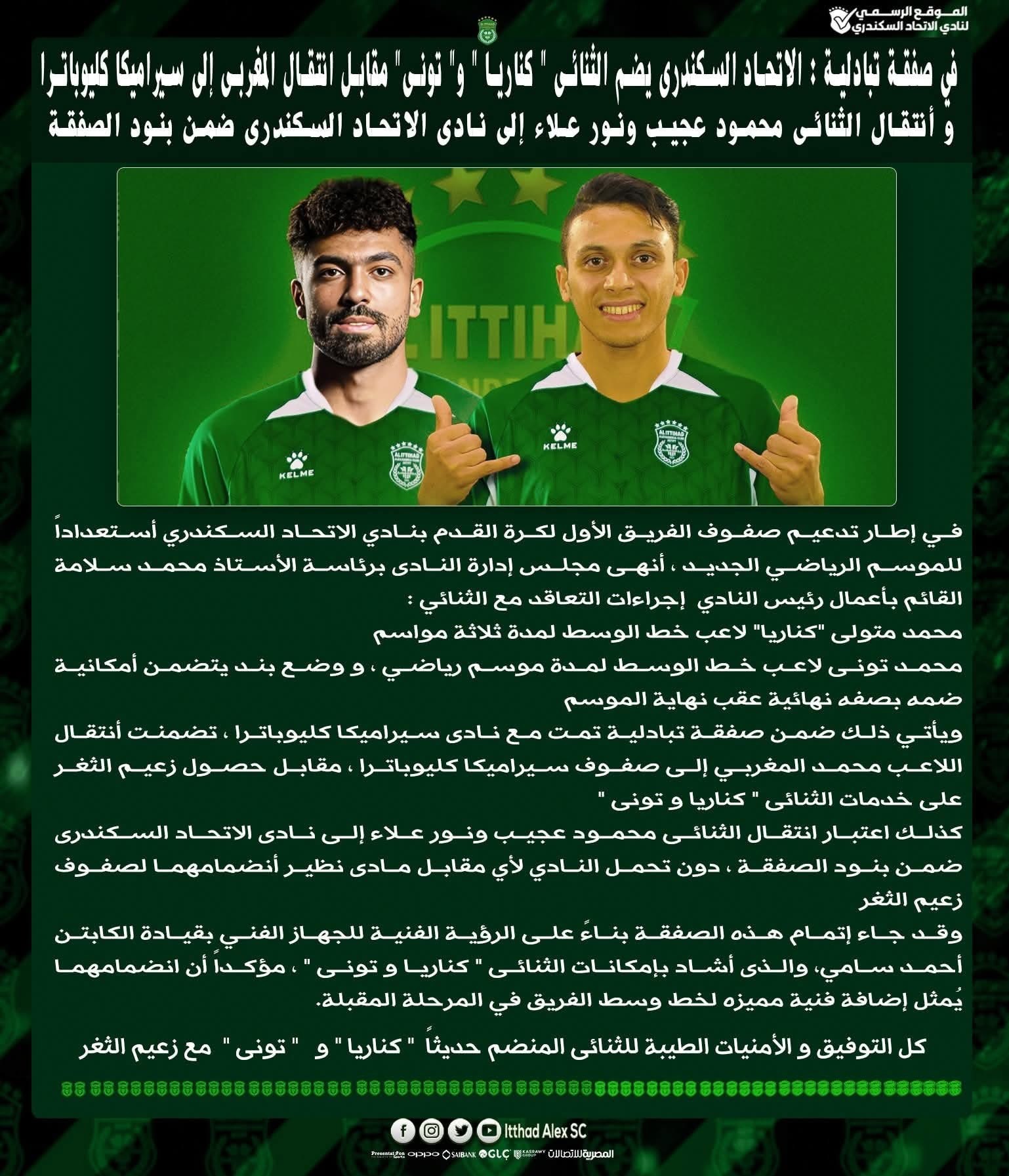 وذكر الاتحاد السكندري، في بيان رسمي، أن مجلس الإدارة برئاسة محمد سلامة، القائم بأعمال رئيس النادي، أنهى إجراءات التعاقد مع الثنائي محمد متولي "كناريا" ومحمد توني، لاعبي وسط سيراميكا.