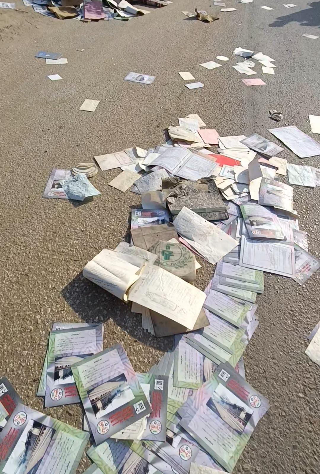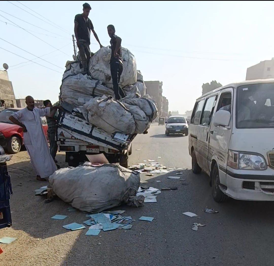 وتسبب الحادث في تناثر المئات من الأوراق والمجلدات على الطريق، مما عرقل حركة المرور لبعض الوقت، وسط محاولات من الأهالي لجمع الورق وإعادة فتح الطريق.