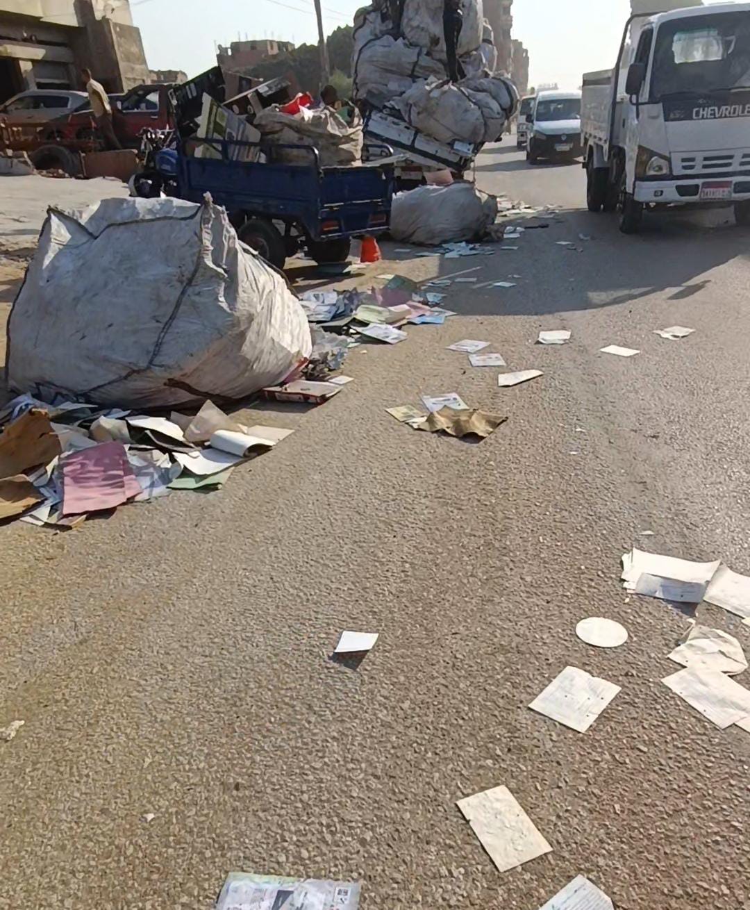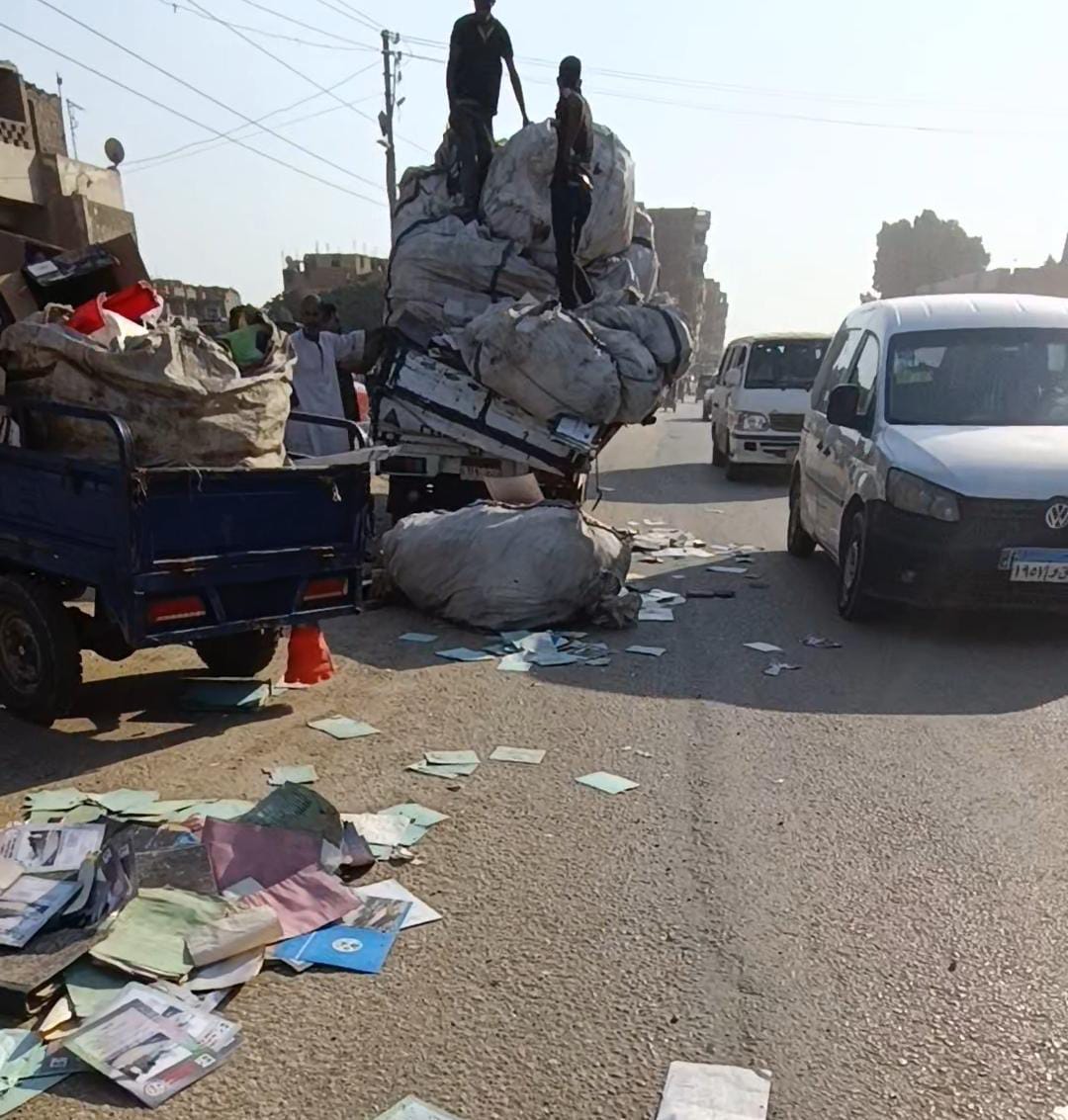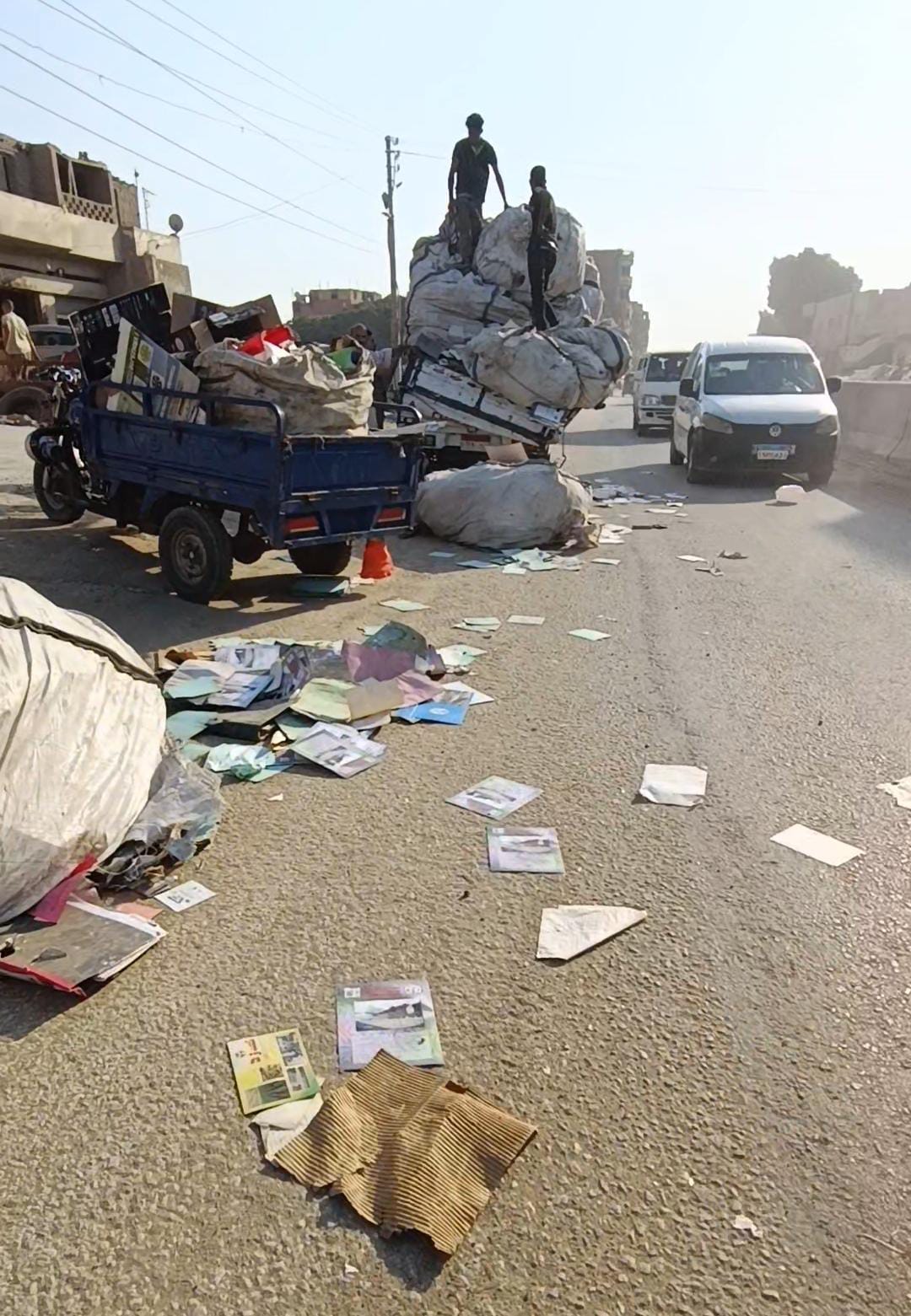 وتظهر الصور سقوط عدد من الأجولة الضخمة المحملة بالورق من على السيارة، فيما صعد عدد من العمال على السيارة لمحاولة إعادة ترتيب الحمولة يدويًا وسط الطريق.