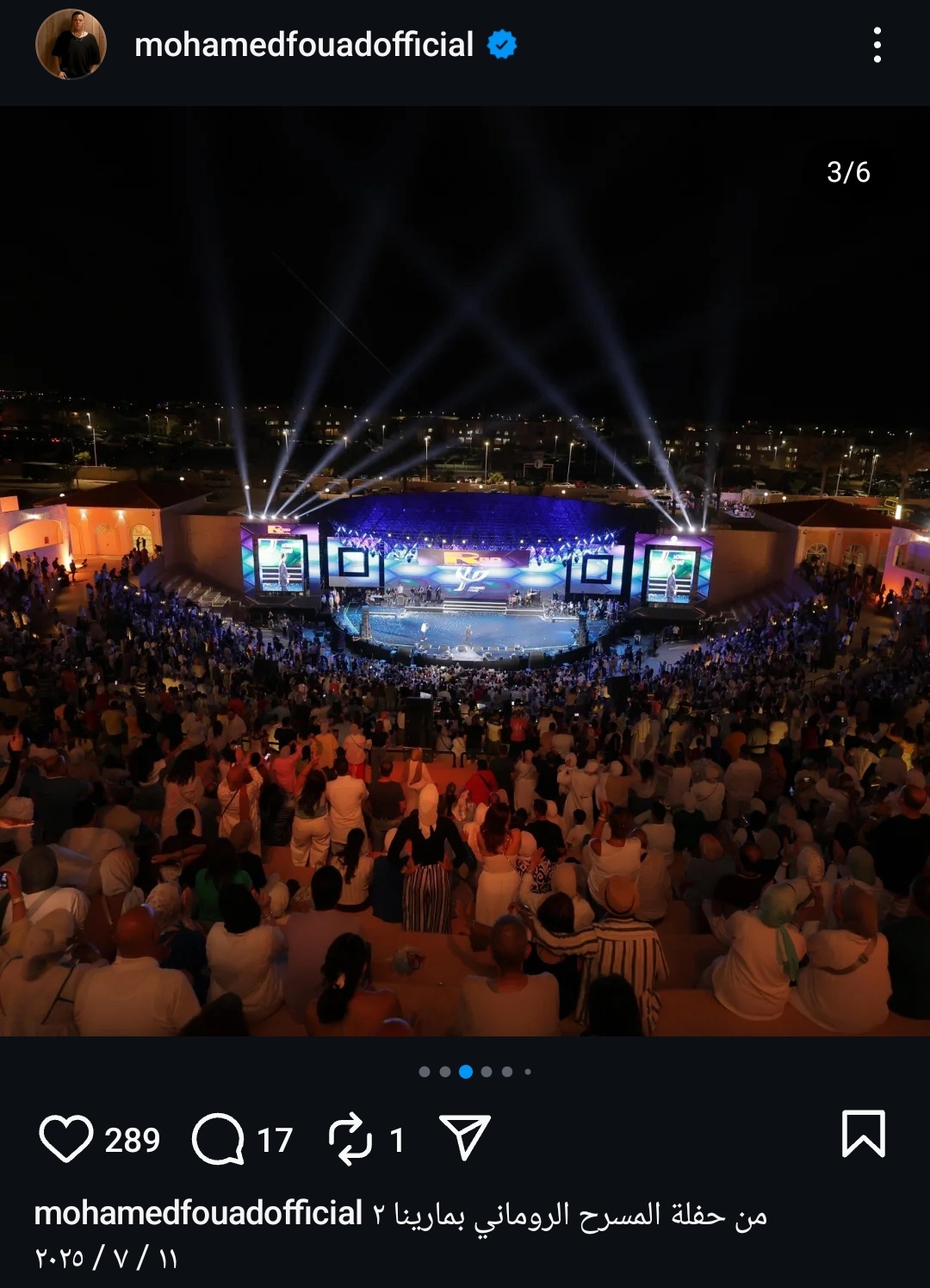 وكتب فؤاد عبر حسابه الرسمي على موقع التواصل الاجتماعي لتبادل الصور والفيديوهات الانستجرام: من حفل المسرح الروماني بمارينا 11/ 2025/7.