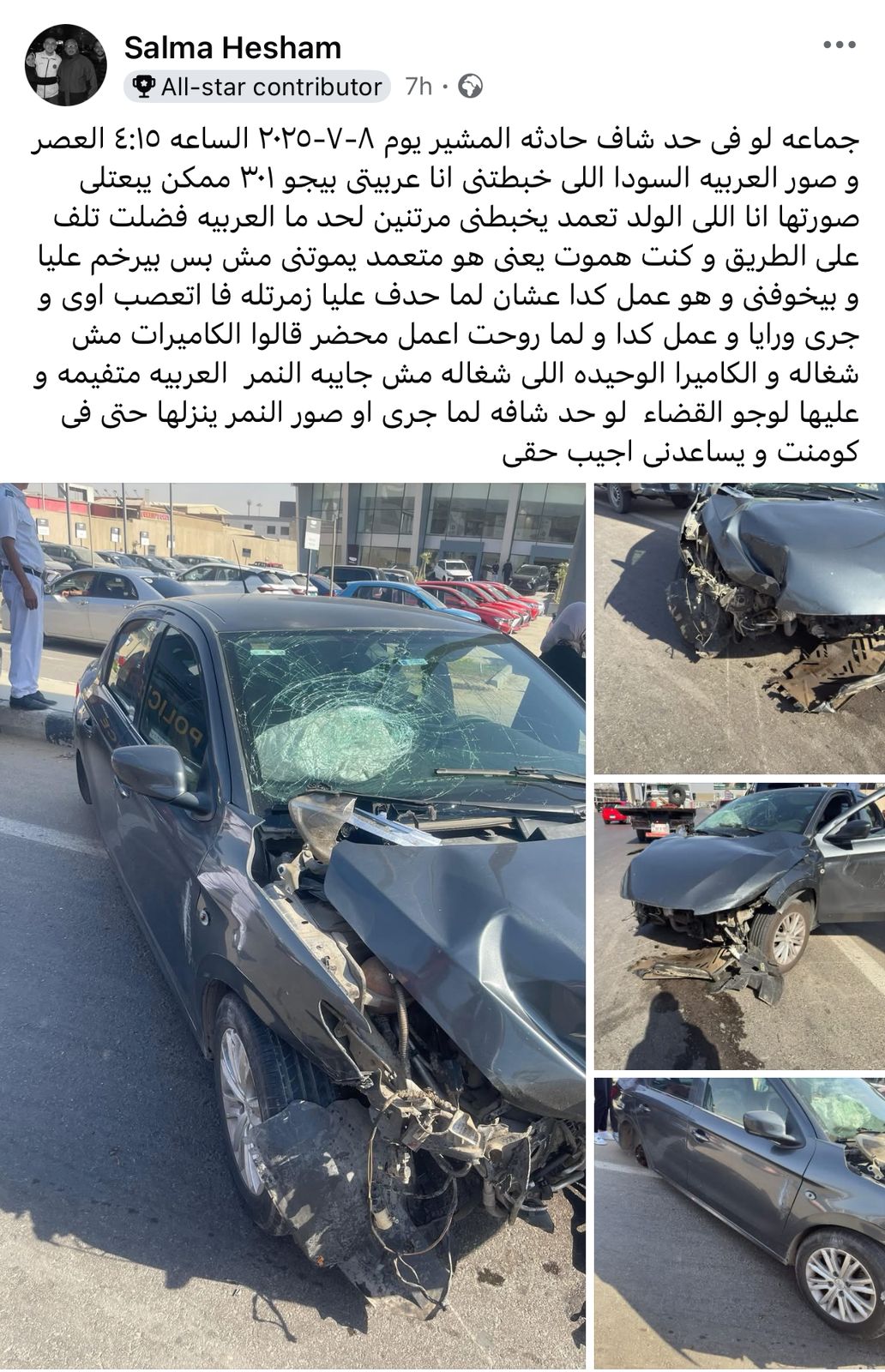 "يا جماعة لو حد شاف حادثة المشير يوم 8-7-2025 الساعة 4:15 العصر وصوّر العربية السودة اللي خبطتني.. عربيتي بيچو 301.. ممكن يبعتلي صورتها. أنا اللي الولد تعمد يخبطني مرتين لحد ما العربية فضلت تلف على الطريق.. كنت هموت.. هو متعمد يقتلني مش بس بيرخم عليا".