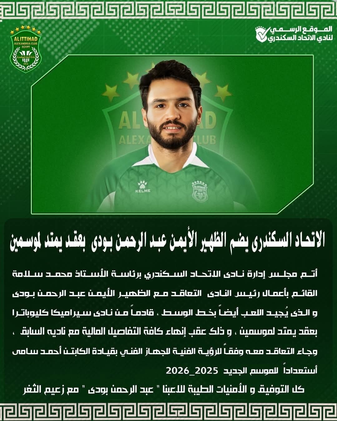 أعلن نادي الاتحاد السكندري برئاسة محمد سلامة، القائم بأعمال رئيس النادي، التعاقد رسميًا مع اللاعب عبد الرحمن بودي، الظهير الأيمن لفريق سيراميكا كليوباترا، في صفقة انتقال نهائي تمتد لمدة موسمين، وذلك في إطار تدعيم صفوف الفريق استعدادًا للموسم الكروي الجديد 2025-2026.