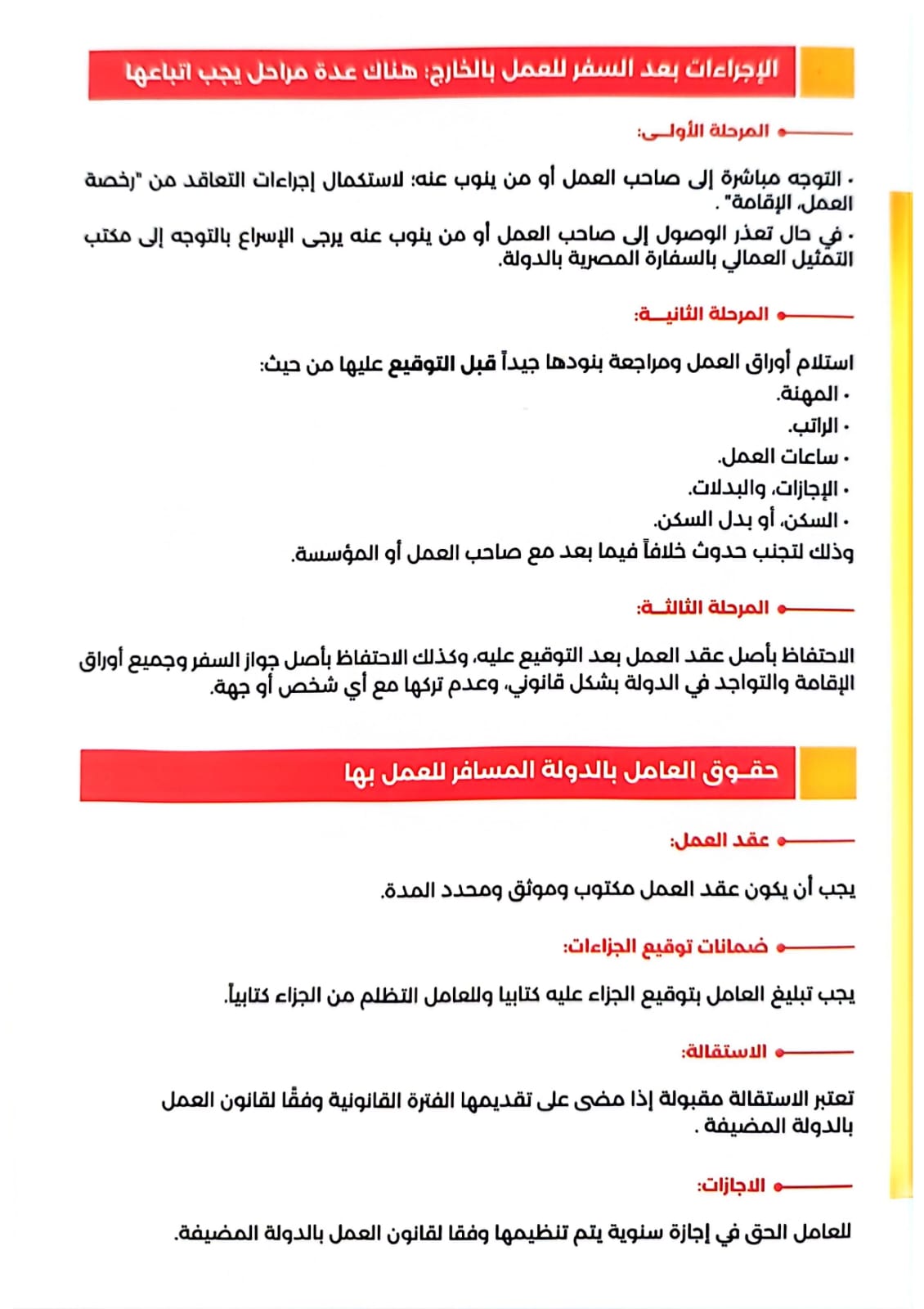 وكذلك الإجراءات المحددة لكل دولة من الدول الأكثر جذبا للكوادر المصرية ، لضمان استيفاء كافة الشروط والمستندات المطلوبة ، وكيفية الحصول على الخدمات التي تضمن لهم الحماية ، كآليات الشكاوى، والحصول على خدمات معيشية مستقبلية كالتسجيل في التأمينات الاجتماعية في مصر..وتحتوي الكتيبات، على توجيهات عامة ،فضلاً عن كتيبات موجهة إلى الدول الموجود فيها مكاتب التمثيل العمالي التابعة لوزارة العمل وهي : "قطر – الإمارات – السعودية – الكويت - العراق – الأردن – لبنان، إيطاليا"..