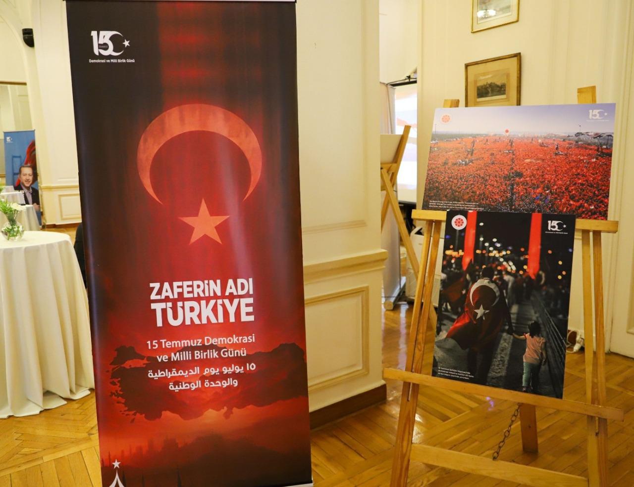 تم احياء يوم الديمقراطية والوحدة الوطنية 15 يوليو في السفارة التركية بالقاهرة، يوم 15 يوليو. وحضر الحفل الذي نظمته السفارة نحو 250 ضيفًا من بينهم عدد من سفراء الدول المختلفة مثل أذربيجان، البانيا ، بروني، إندونيسيا، الفلبين ، العراق، قطر ، كمبوديا، منغوليا ، باكستان ، سلوفانيا ، شيلي ، السنغافورة، فينزويلا ، فيتنام ، تنزانيا المقيمين في القاهرة وسفير ورئيس كتب رعاية المصالح الإيرانية بالقاهرة والقائم بالأعمال للسفارة السورية بالقاهرة و ممثلون عن المجتمع المصري وأعضاء بارزون في مجلس الشيوخ والأكاديميين ورجال الصحافة المصرية ورجال الأعمال الأتراك والمواطنين.