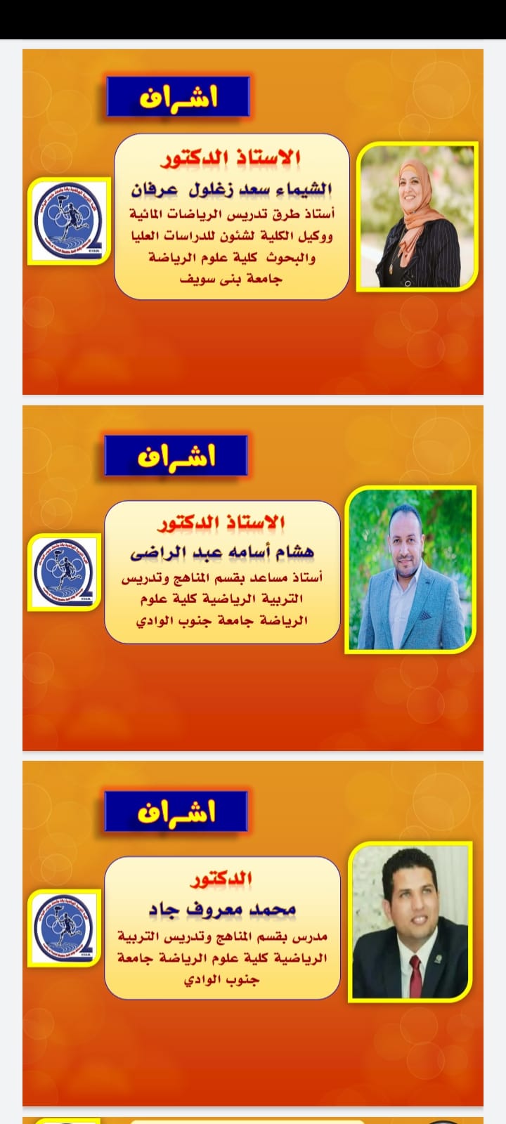 وناقشت لجنة الحكم والمناقشة تحت إشراف الأستاذ الدكتور الشيماء سعد زغلول عرفان، أستاذ طرق تدريس الرياضات المائية ووكيل الكلية لشئون للدراسات العليا والبحوث كلية علوم الرياضة جامعة بنى سويف، والأستاذ الدكتور هشام أسامه عبد الراضي، أستاذ مساعد بقسم المناهج وتدريس التربية الرياضية كلية علوم الرياضة جامعة جنوب الوادي، والدكتور محمد معروف جاد، مدرس بقسم المناهج وتدريس التربية الرياضية كلية علوم الرياضة جامعة جنوب الوادي.