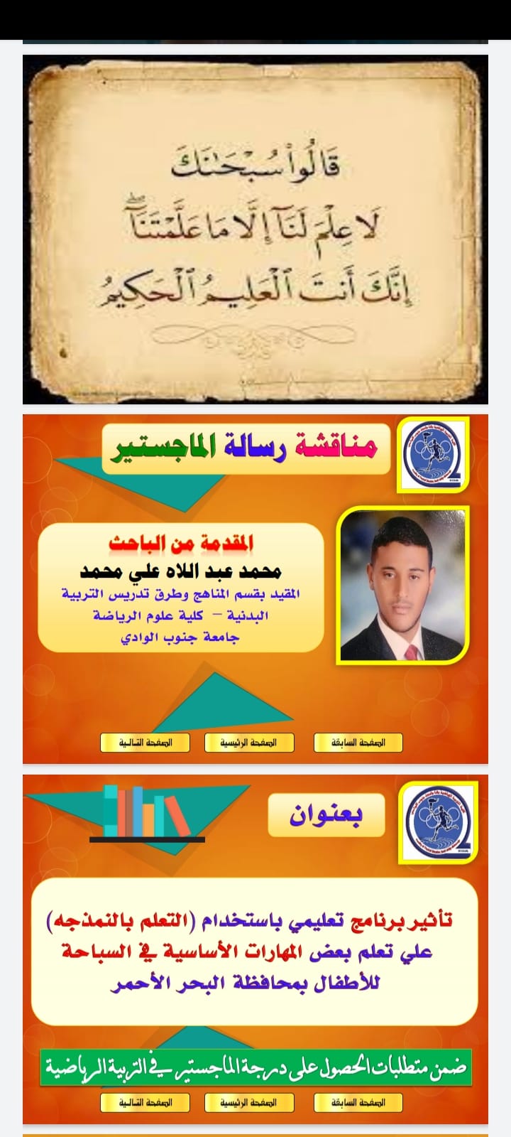 حصل الباحث محمد عبد اللاه علي محمد، على درجة الماجستير عن رسالته المقدمة تحت عنوان: «تأثير برنامج تعليمي باستخدام (التعلم بالنمذجه) علي تعلم بعض المهارات الأساسية في السباحة للأطفال بمحافظة البحر الأحمر» من كلية علوم الرياضة جامعة جنوب الوادي.
