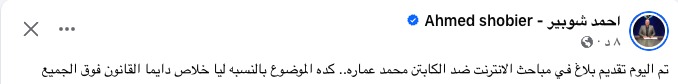 وكتب شوبير، عبر صفحته الرسمية على "فيسبوك":"تم اليوم تقديم بلاغ في مباحث الإنترنت ضد الكابتن محمد عمارة.. بالنسبة لي انتهى الموضوع، فالقانون دائمًا فوق الجميع."