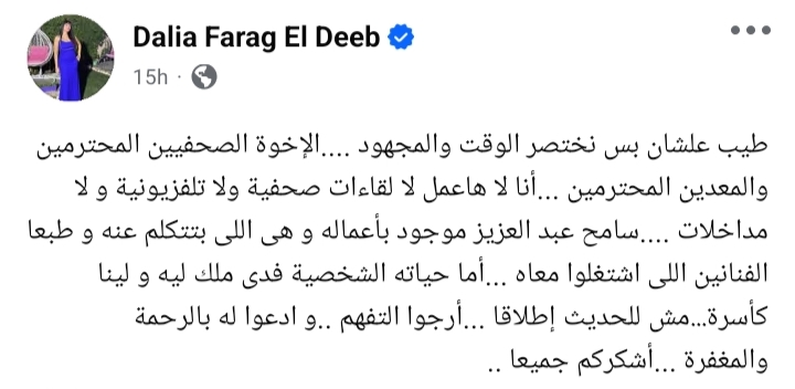 وكتبت داليا فرج من خلال حسابها الرسمي عبر موقع التواصل الاجتماعي فيسبوك، قالت: "طيب علشان بس نختصر الوقت والمجهود ....الإخوة الصحفيين المحترمين والمعدين المحترمين ...أنا لا هاعمل لا لقاءات صحفية ولا تلفزيونية و لا مداخلات ....سامح عبد العزيز موجود بأعماله و هى اللى بتتكلم عنه و طبعا الفنانين اللى اشتغلوا معاه ...أما حياته الشخصية فدى ملك ليه و لينا كأسرة...مش للحديث إطلاقا ...أرجوا التفهم ..و ادعوا له بالرحمة والمغفرة ...أشكركم جميعا".