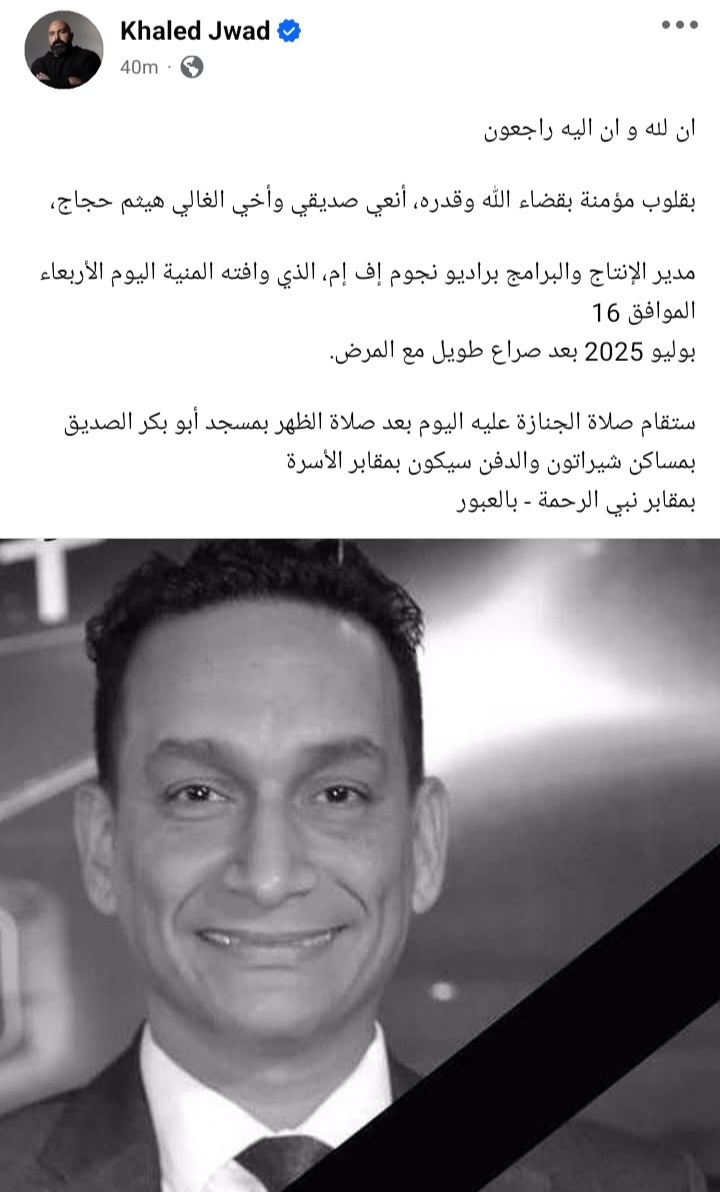 وأعلن الإذاعي خالد جواد عن وفاته و عن موعد ومكان الجنازة، وكتب من خلال حسابه الرسمي عبر موقع التواصل الاجتماعي فيسبوك، قال: "ان لله و ان اليه راجعون.. بقلوب مؤمنة بقضاء اللّٰه وقدره، أنعي صديقي وأخي الغالي هيثم حجاج، مدير الإنتاج والبرامج براديو نجوم إف إم، الذي وافته المنية اليوم الأربعاء الموافق 16 يوليو 2025 بعد صراع طويل مع المرض".