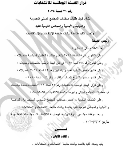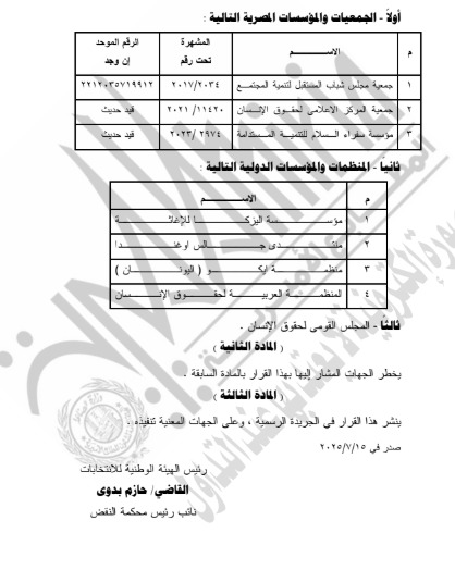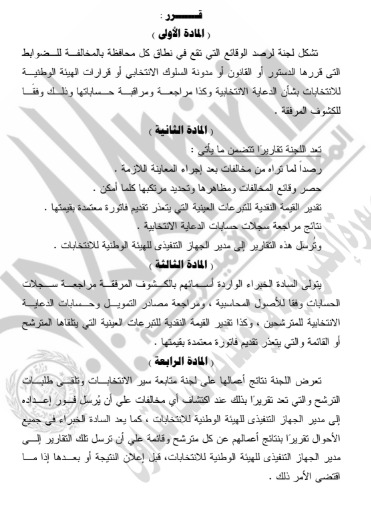 أصدرت الهيئة الوطنية للانتخابات، بيانًا مهما بشأن رصد مخالفات الدعاية الانتخابية، تشكيل لجنة لرصد الوقائع التي تقع في نطاق كل محافظة للضوابط التي قررها الدستور والقانون، أو مدونة السلوك الانتخابي أو قرارات الهيئة بشأن الدعاية ومراقبة حساباتها وذلك وفقًا للكشوف المرفقة بالجريدة الرسمية.