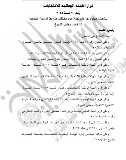 الهيئة الوطنية للانتخابات تشكل لجان رصد مخالفات دعاية انتخابات مجلس الشيوخ