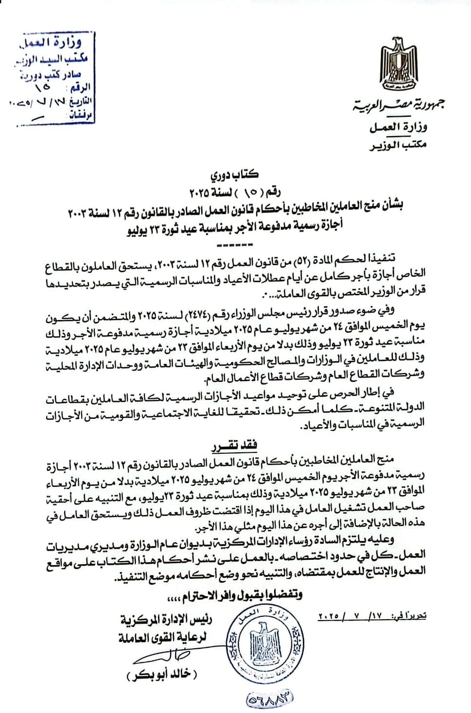وأصدرت وزارة العمل اليوم الخميس ،"الكتاب الدوري رقم 15 لسنة 2025 " بشأن تنظيم الإجازة الرسمية للعاملين بمناسبة عيد ثورة 23 يوليو ، ونص على التزام جميع جهات العمل والإنتاج بتطبيق أحكامه، والتنبيه على رؤساء الإدارات المركزية بديوان عام الوزارة، ومديري مديريات العمل بالمحافظات، كلٌ في نطاق اختصاصه، بنشر التعليمات وتنفيذها في مواقع العمل المختلفة.