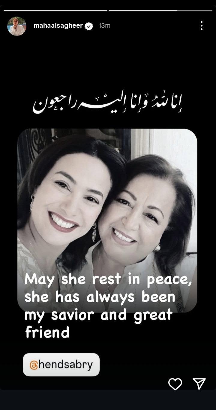 ودعت مها الصغير السيدة داليندا والدة هند صبري بكلمات مؤثرة، حيث نشرت صورة لهند صبري ووالدته، من خلال حسابها الرسمي عبر موقع تبادل الصور والفديوهات القصيرة إنستجرام، عبر خاصية استوري، وكتبت: إنا لله و إنا إليه راجعون.. رحمها الله لطالما كانت دائما منقذي وصديقتي العزيزة.