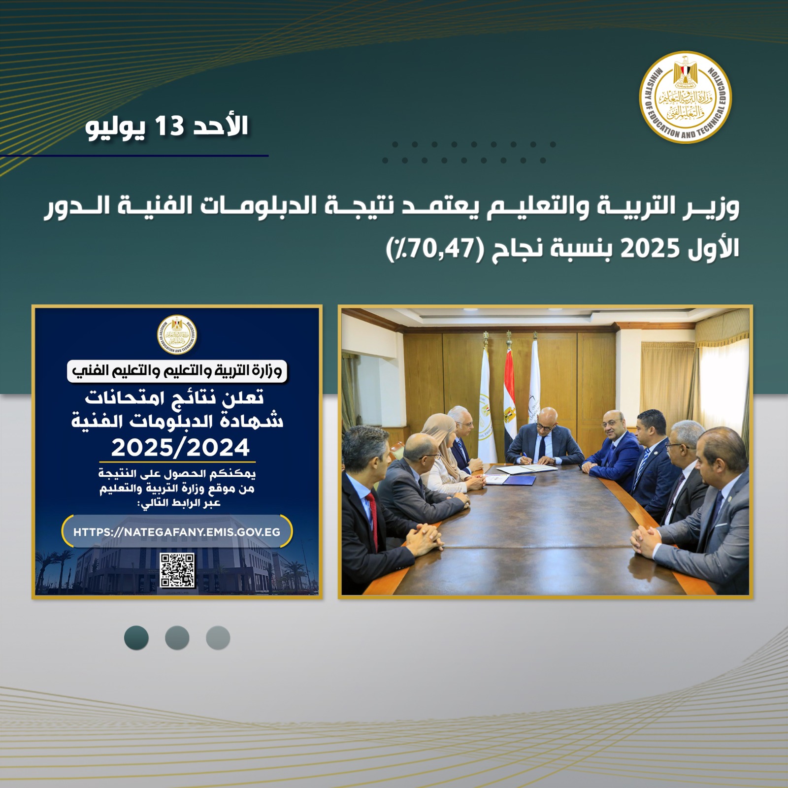 اعتمد السيد محمد عبد اللطيف وزير التربية والتعليم والتعليم الفنى، نتيجة امتحانات الدبلومات الفنية للدور الأول للعام الدراسي ٢٠٢٤/ ٢٠٢٥.