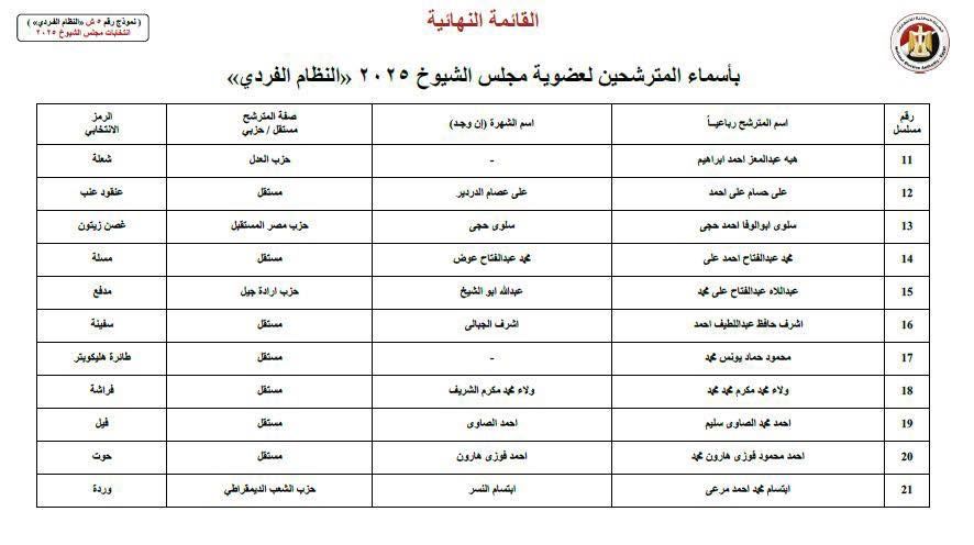 نشرت الهيئة الوطنية للانتخابات الكشوف النهائية للمترشحين لعضوية مجلس الشيوخ 2025 ورموزهم، عن دائرة محافظة قنا والبالغ عددهم 24 مترشحًا.