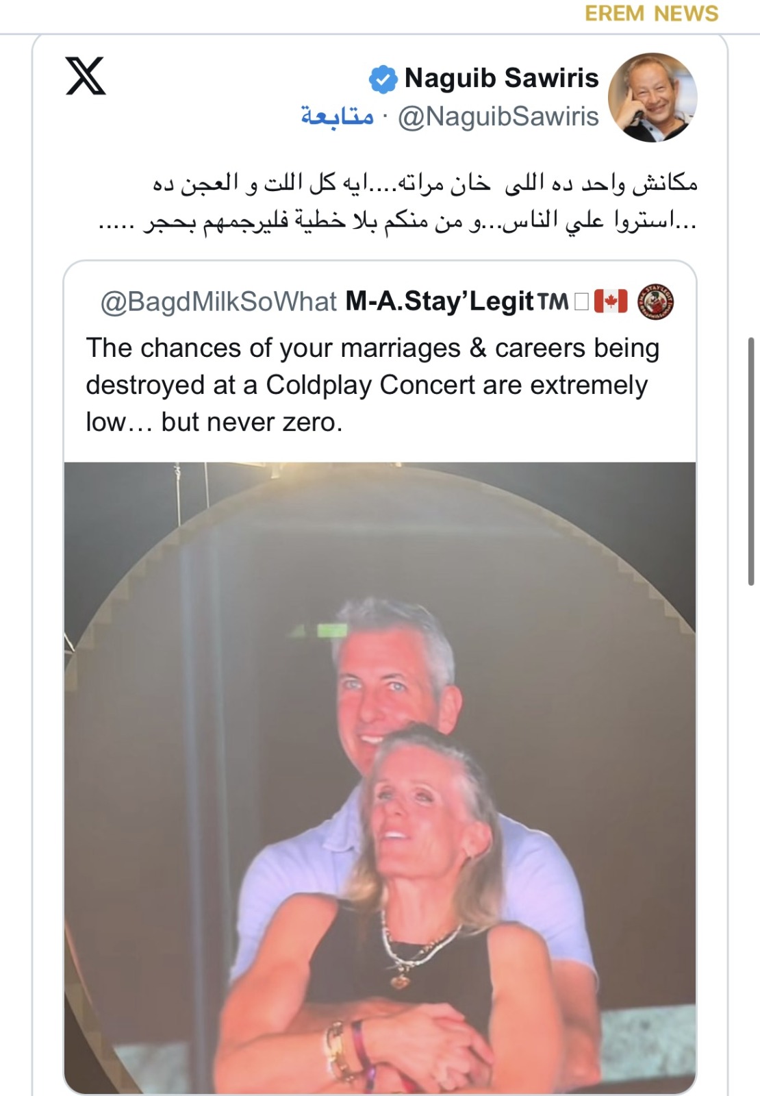 علق رجل الأعمال المهندس نجيب ساويرس على الجدل المثار حول فيديو الخيانة الزوجية، الذي أشعل مواقع التواصل الاجتماعي خلال الأيام الماضية، بعد اكتشاف علاقة بين المدير التنفيذي آندي بيرون على علاقة غير شرعية مع مديرة الموارد البشرية في الشركة التي يعمل بها، وذلك أثناء وجودهم في حفلة كولد بلاي.