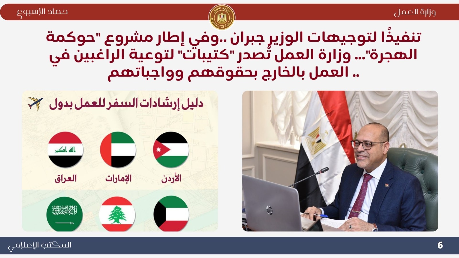 في إطار مشروع تعزيز حوكمة الهجرة من خلال الدعم المؤسسي الذي تنفذه "الوزارة"، بالتعاون مع اللجنة الوطنية التنسيقية لمكافحة الهجرة غير الشرعية والإتجار بالبشر، وصندوق مكافحة الهجرة غير الشرعية وحماية المهاجرين والشهود والممول من الوكالة الإسبانية للتنمية الدولية"CONMIGO"، أصدرت وزارة العمل، مجموعة من "الكتيبات التوعوية" ،بهدف رفع وعي الراغبين بالعمل في الخارج بأهم القنوات الشرعية والرسمية التي يجب اتباعها للالتحاق بسوق العمل بدول أخرى ، ومعرفة الإرشادات العامة، والإجراءات التي يجب اتباعها في حالة السفر لأي دولة، وكذلك الإجراءات المحددة لكل دولة من الدول الأكثر جذبا للكوادر المصرية ، لضمان استيفاء كافة الشروط والمستندات المطلوبة ، وكيفية الحصول على الخدمات التي تضمن لهم الحماية ، كآليات الشكاوى، والحصول على الخدمات.