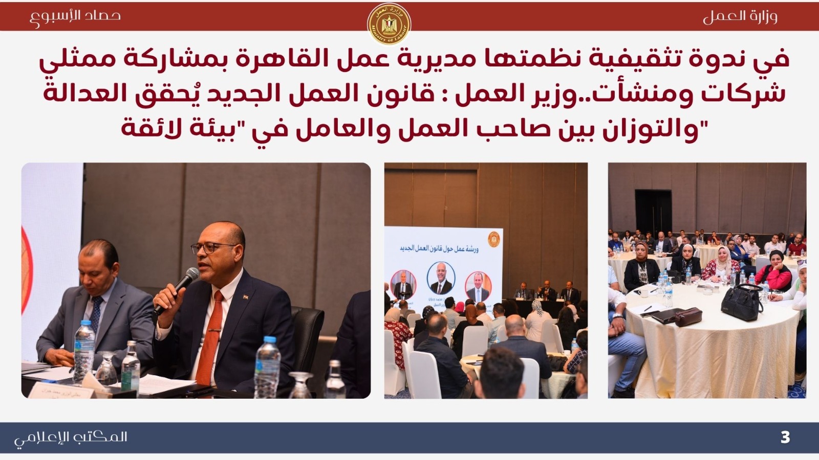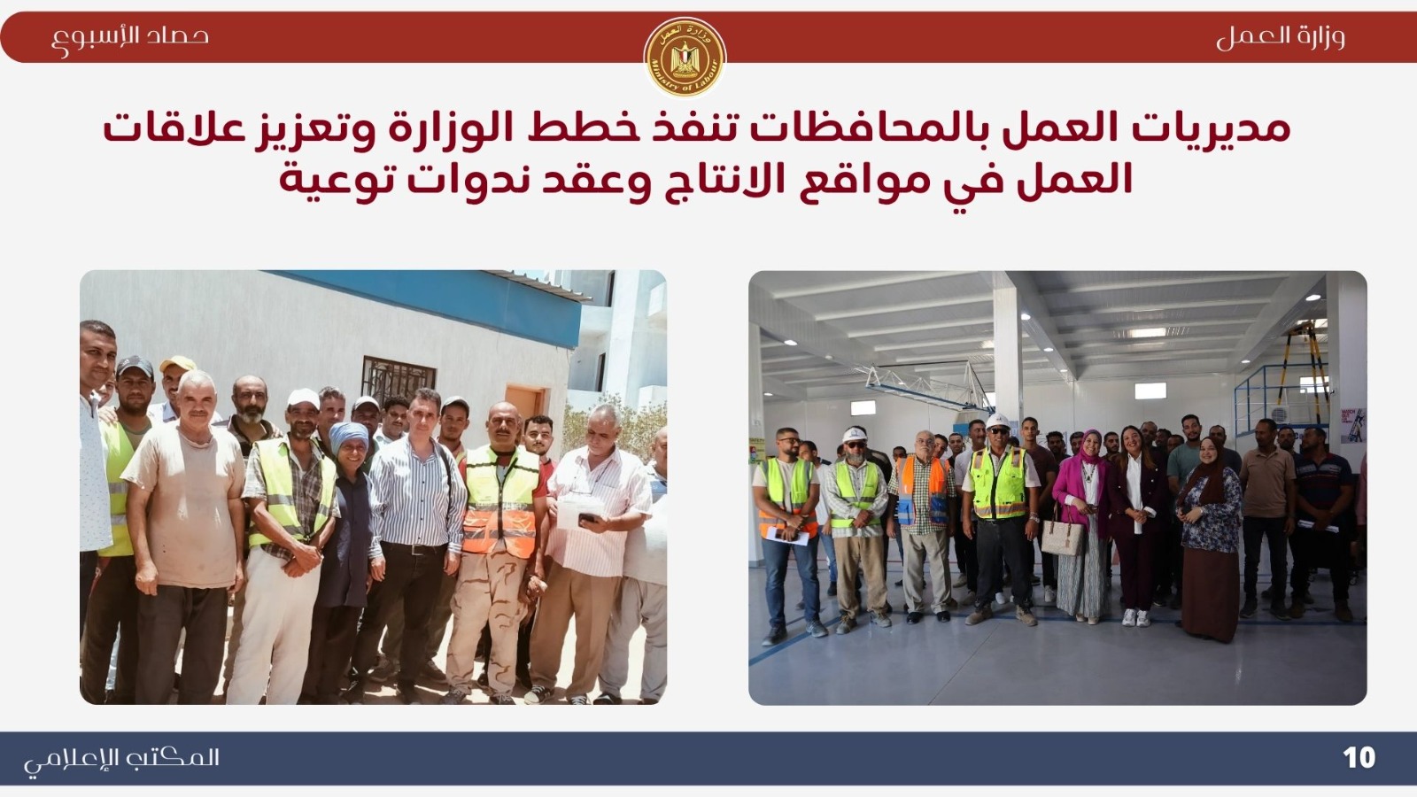 كما وصلت مديريات العمل تنفيذ خطط الوزارة. بتعزيز علاقات العمل في مواقع الإنتاج ،ونشر ثقافة السلامة والصحة المهنية ، والتوسع في برامج التدريب المهني من أجل التشغيل.. وتنفيذًا لتوجيهات وزير العمل ،شارك وفد من "الوزارة" برئاسة إيهاب عبدالعاطي المستشار القانوني للوزير ،في ورشة عمل نظمتها اللجنة الاقتصادية بالمجلس القومي لحقوق الإنسان، بمقر "المجلس" بالقاهرة ، بعنوان "تعزيز حقوق العمال والعمل اللائق .. نحو بيئة عمل آمنة " ، والتي افتتحها ، هاني ابراهيم الأمين العام للمجلس ،ومحمد ممدوح أمين لجنة الحقوق الاقتصادية.