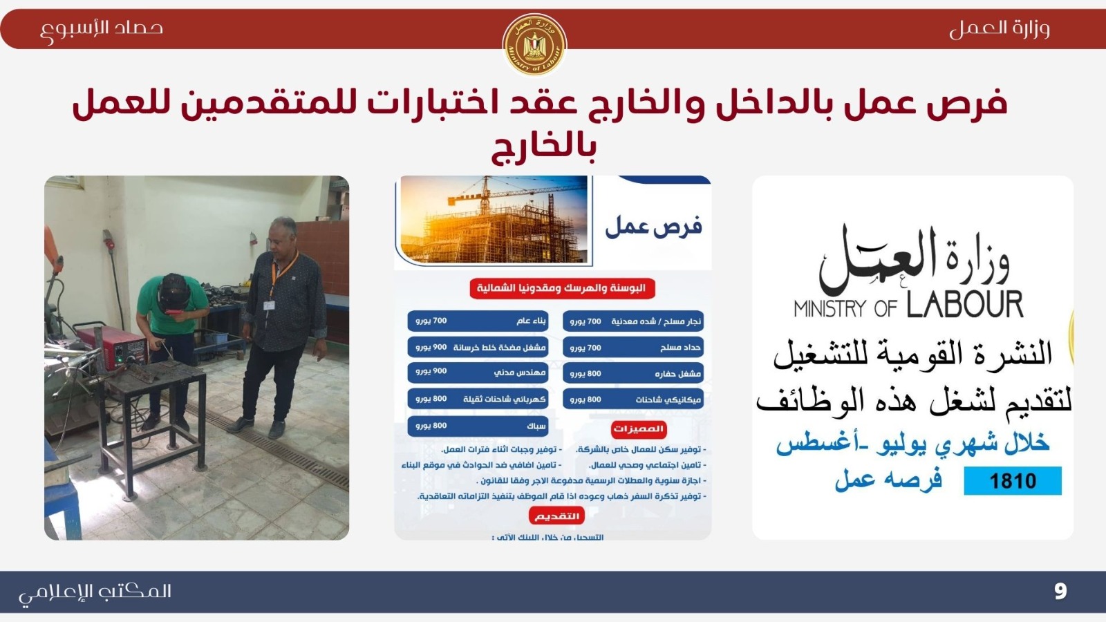 واصلت وزارة العمل جهودها في تنفيذ العديد من الخطط على أرض الواقع ، من خلال الأنشطة التي نفذتها خلال الـ 7 أيام الماضية ،من بينها استمرار الاختبارات العملية والنظرية للكوادر المصرية المرشحة للعمل بالخارج عن طريق فرص العمل التي تعلن عنها الوزارة بالتنسيق مع مكاتب التمثيل العمالي بالخارج.