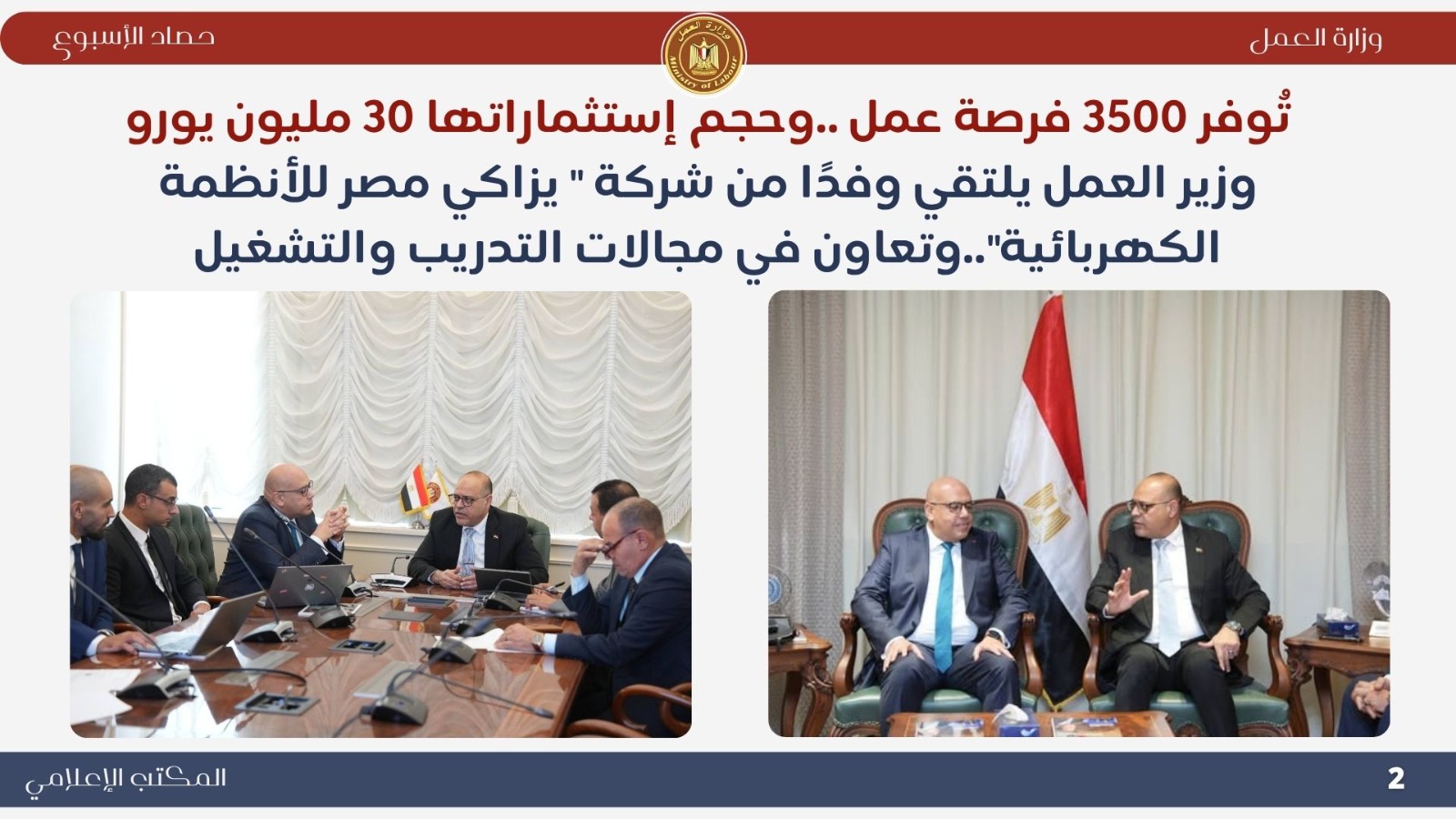 والتقى الوزير مع وفد من شركة "يازاكي مصر" للأنظمة الكهربائية لتعزيز التعاون في مجالات التدريب والتشغيل، كما التقى مع وفد من شركة "تيتان تو هولدينج" الروسية العاملة في مشروع الضبعة النووي للتعاون في توفير فرص عمل للشباب بحسب احتياجات الشركة وتأهيل الكوادر اللازمة للعمل فيها