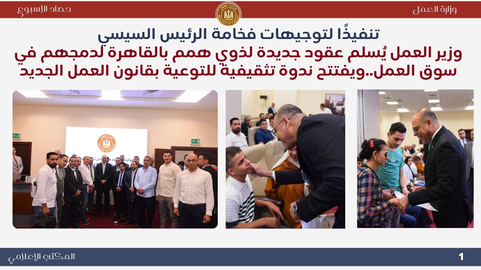 كما قام وزير العمل محمد جبران بتسليم عقود عمل لذوي همم من محافظة القاهرة في إطار تنفيذ توجيهات الرئيس عبدالفتاح السيسي رئيس الجمهورية بدمج في سوق العمل، كما افتتح الوزير ندوات تثقيفية بمشاركة العديد من الشركات للتوعية بقانون العمل الجديد.