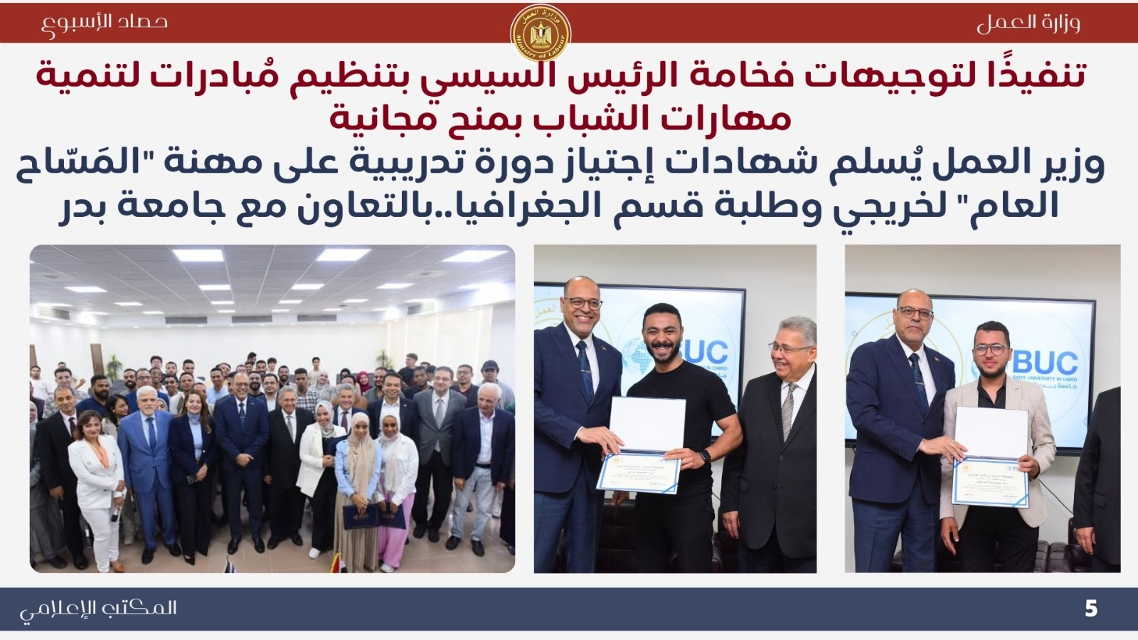كما قام الوزير بتسليم شهادات اجتياز دورة تدريبية مجانية لطلاب وخريجي كليات الآداب قسم الجغرافية بهدف تأهيلهم للعمل على مهنة "مساح عام " بالتعاون مع جامعة بدر، كاول ثمرة من ثمار هذا التعاون مع الجامعة، وتنفيذ توجيهات فخامة الرئيس السيسي بتقديم منح مجانية لتأهيل الشباب على احتياجات سوق العمل..وتنفيذًا لتوجيهات وزير العمل.