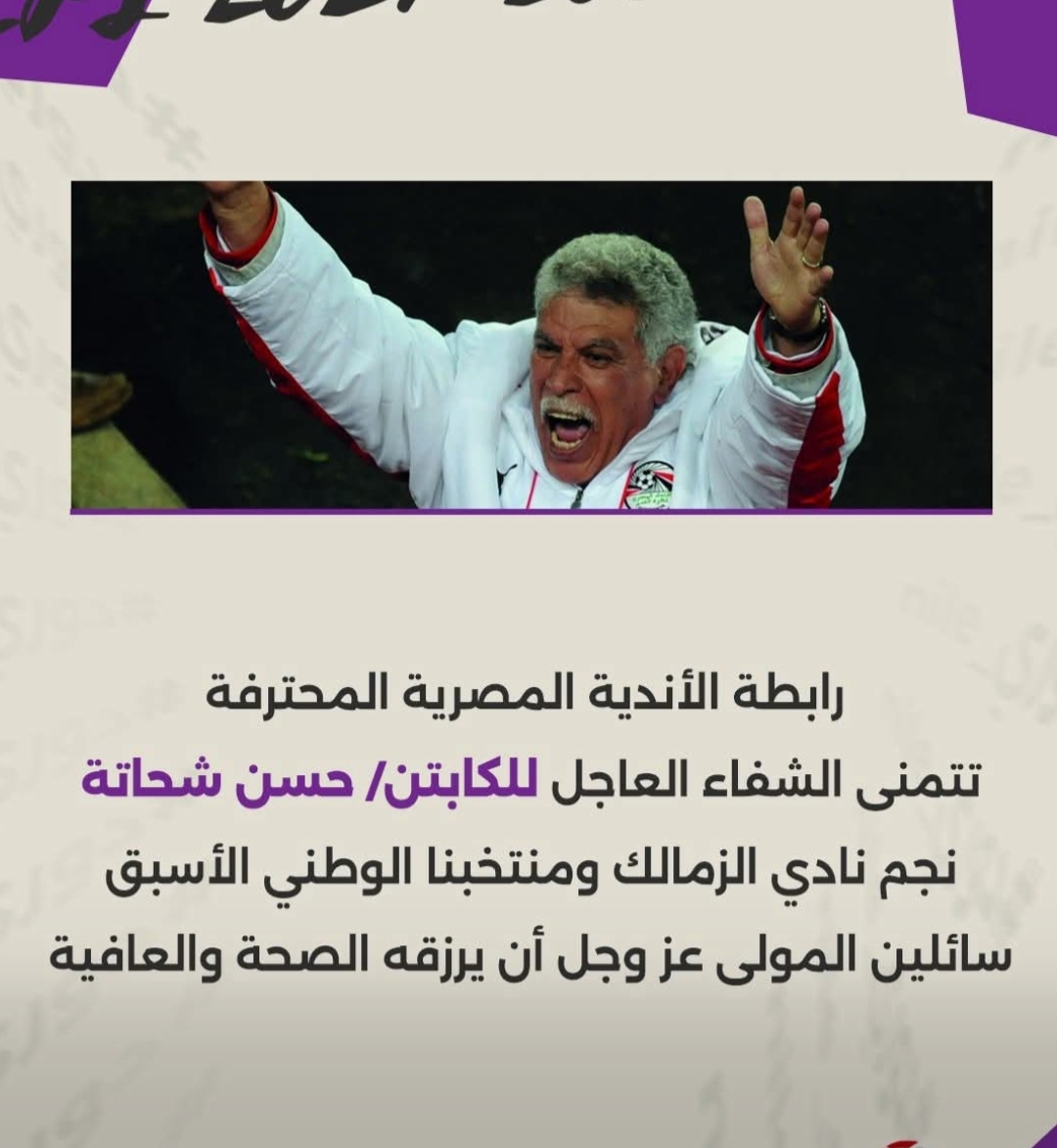 تمنت رابطة الأندية المصرية الشفاء العاجل لنجم نادي الزمالك والمدير الفني القدير الأسبق للمنتخب المصري المعلم حسن شحاته بعد تعرضه لوعكة صحية.