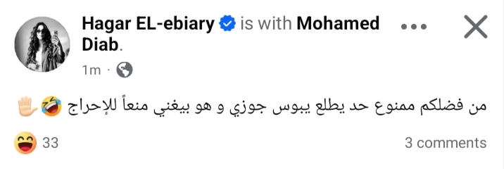 حيث كتبت من خلال حسابها الرسمي عبر موقع التواصل الاجتماعي فيسبوك، قالت: "من فضلكم ممنوع حد يطلع يبوس جوزي وهو بيغني منعًا للإحراج".