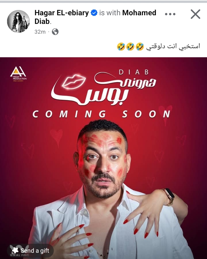 وفي منشور آخر، نشرت بوستر للفنان دياب عليه كلمة"هروني بوس"، وعلقت عليه، وكتبت:" استخبى انت دلوقتي".