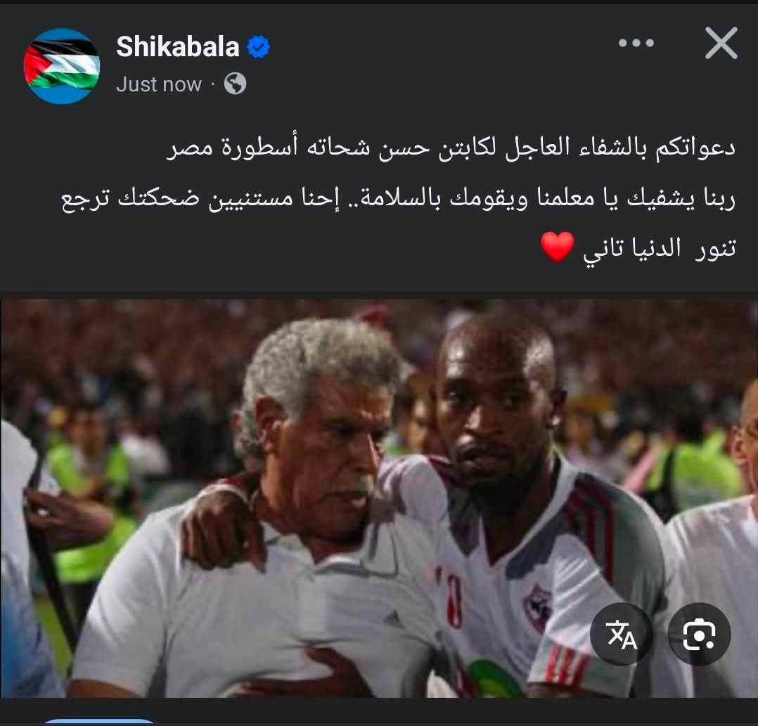 وكتب شيكابالا: “دعواتكم بالشفاء العاجل لكابتن حسن شحاتة أسطورة مصر. ربنا يشفيك يا معلمنا ويقومك بالسلامة.. احنا مستنيين ضحكتك ترجع تنور الدنيا تاني.”