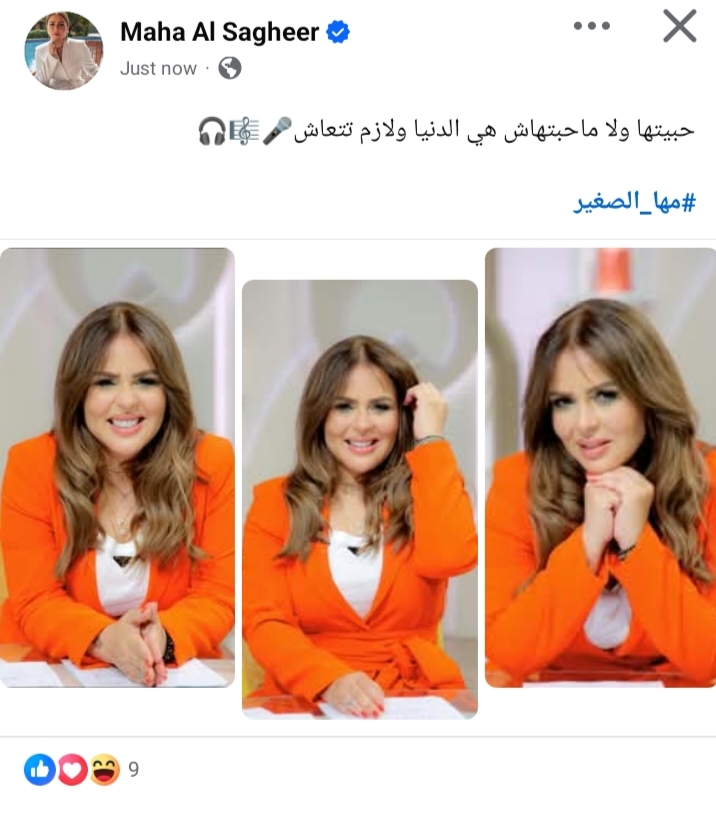وشاركت مها الصغير جمهورها صور من إحدى حلقاتها في برنامجها الستات مبيعرفوش يكدبوا، ورافقتها برسالة غامضة، من خلال حسابها الرسمي عبر موقع التواصل الاجتماعي فيسبوك، وكتبت: "حبيتها ولا ماحبتهاش هي الدنيا ولازم تتعاش".