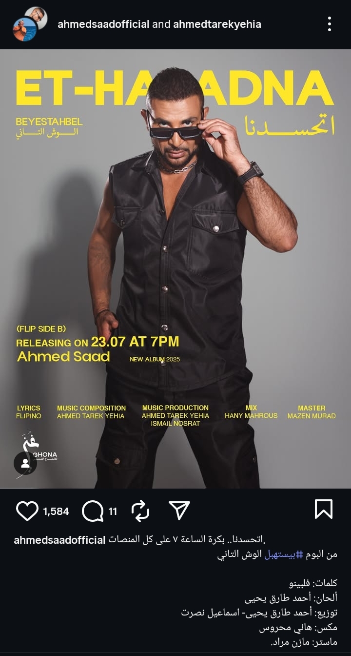 ونشر أحمد سعد بوستر الألبوم الجديد عبر حساباته الرسمية على مواقع التواصل الاجتماعي وعلق، "جاهزين يوم الأربعاء.. الوش التاني من ألبومي الجديد "بيستهبل".