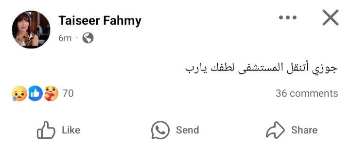 وكتبت تيسير فهمي من خلال حسابها الرسمي عبر موقع التواصل الاجتماعي فيسبوك، قالت: "جوزي أتنقل المستشفى لطفك يارب".