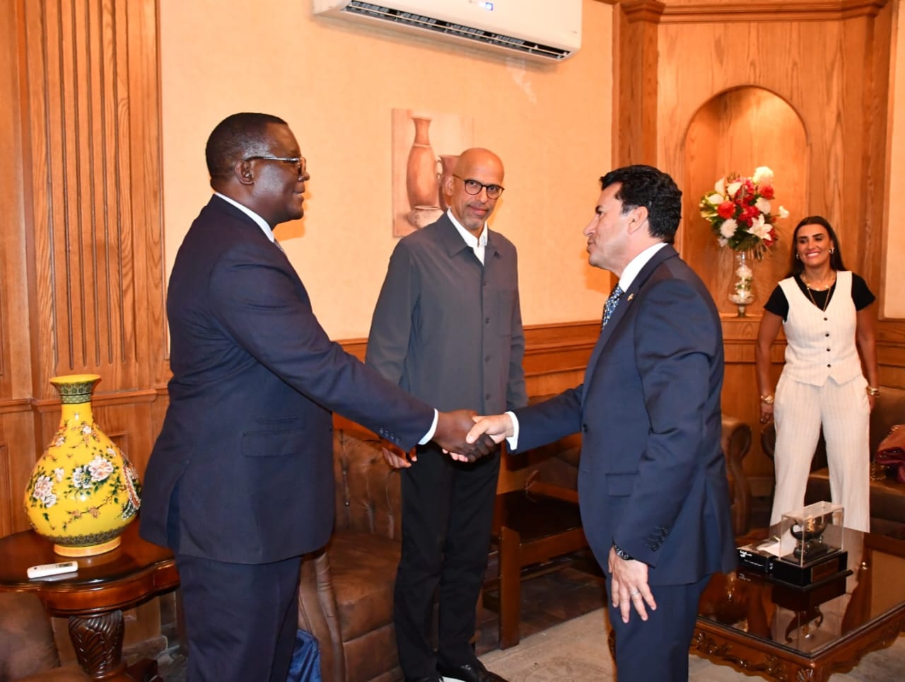 استقبل عصر اليوم الدكتور أشرف صبحي وزير الشباب والرياضة كلا من السيد ويليام لويس ماري الرئيس التنفيذي للاتحاد الدولي للاسكواش ورئيس الاتحاد الأفريقي للاسكواش لاكي مليلو والمهندسة امنه الطرابلسي رئيس الاتحاد المصري للاسكواش وذلك بمجمع حمامات السباحة باستاد القاهرة.