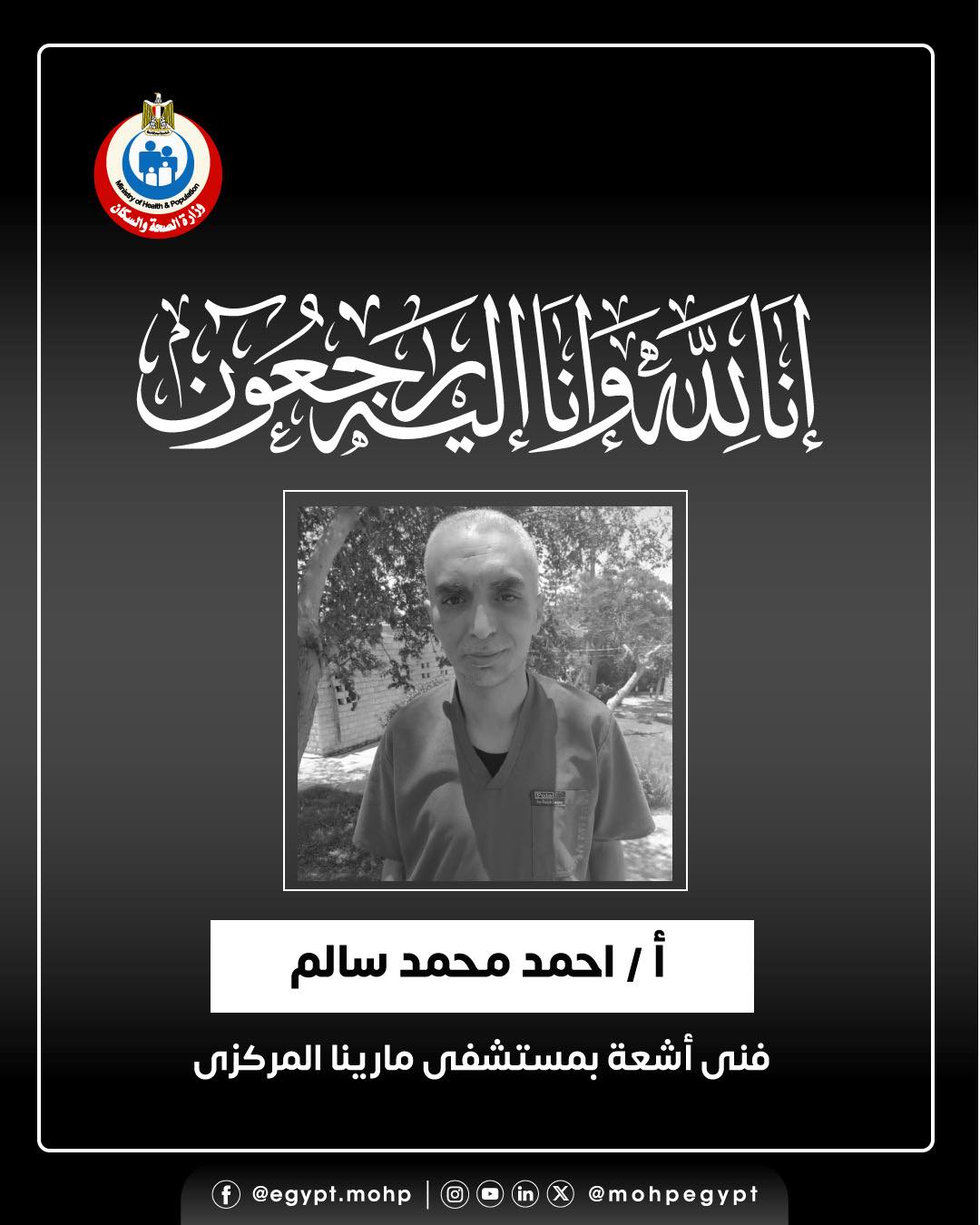نائب رئيس مجلس الوزراء وزير الصحة ينعي فني أشعة بمستشفى مارينا المركزي