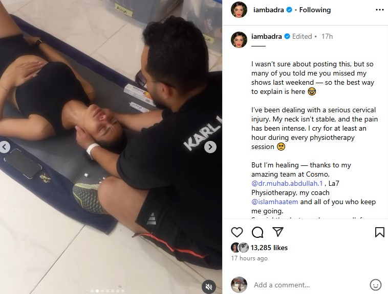 بدرة.. اختفت الراقصة الاستعراضية بدرة عن الساحة الفنية الفترة الماضية، مما أثار قلق جمهورها ومتابعيها، لتكشف بدرة لجمهورها عن سبب غيابها، حيث تعرضت لـ إصابة خطيرة في رقبتها، لذلك تتلقى العلاج.